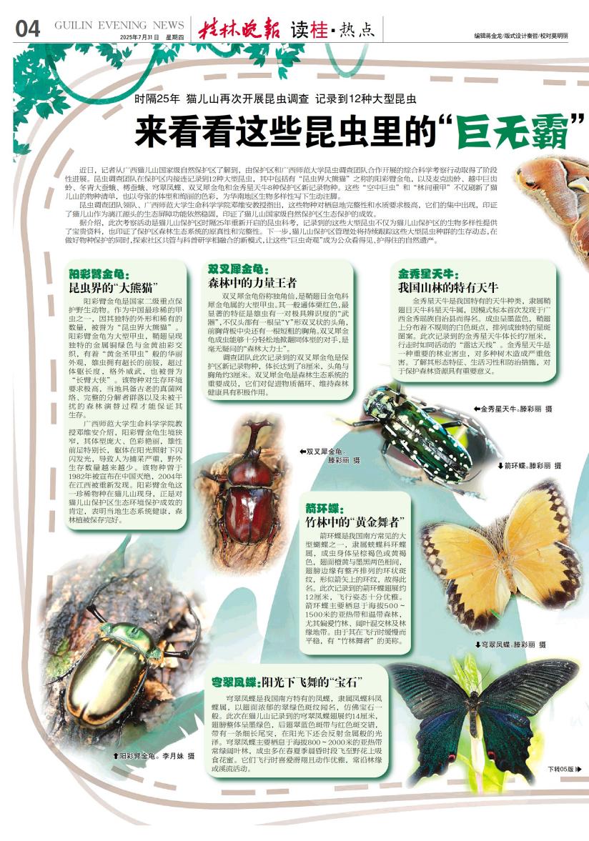 7月31日,桂林晚报以《时隔25年 猫儿山再次开展昆虫调查 记录到12种大型昆虫 来看看这些昆虫里的‘巨无霸’》为文章题目,关注报道我院昆虫调查团队在猫儿山中调查记录到12种大型昆虫,昆虫调查团队领队、我院邓维安教授指出,这些昆虫的发现印证了猫儿山作为漓江源头生态屏障功能稳固,也印证了猫儿山国家级自然保护区生态保护成效显著 。