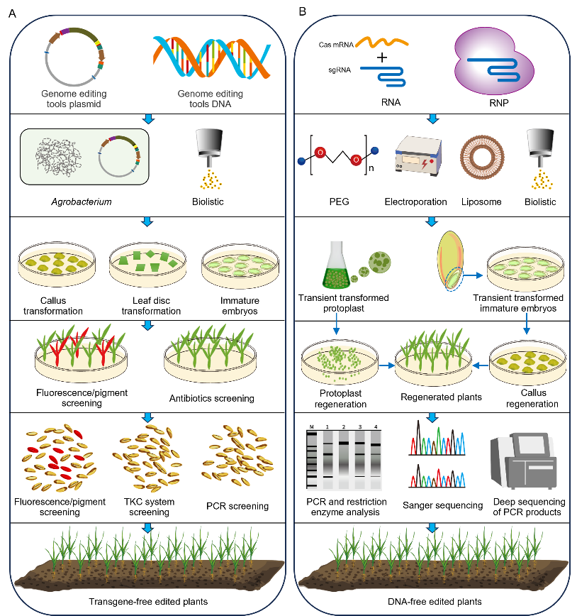 CRISPR/Cas基因编辑技术已成为生物育种的高效工具。该技术可通过两种主要途径获得无外源遗传物质残留的基因编辑作物(Genome Edited Organisms, GEOs):(1)基于稳定遗传转化,编辑完成后通过自交或杂交筛选获得不含CRISPR/Cas元件的无转基因(Transgene-free)编辑后代;(2)基于瞬时转化,编辑目标基因后,获得无外源DNA插入(DNA-free)的编辑植株。由于不含外源转基因,GEOs在监管上区别于传统转基因作物(GMOs),通常面临更宽松的监管环境,有助于加速其产业化进程。目前,研究者们已开发出多种策略用于高效创制Transgene-free / DNA-free的基因编辑作物。