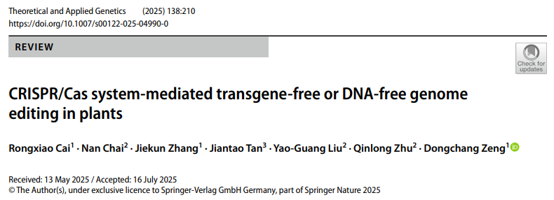 该综述论文以题为“CRISPR/Cas System-Mediated Transgene-Free or DNA-Free Genome Editing in Plants”在线发表于国际知名遗传学期刊《Theoretical and Applied Genetics》(中科院一区Top,5年影响因子IF=4.9)。广西师范大学珍稀濒危动植物生态与环境保护教育部重点实验室,广西漓江流域景观资源保育与可持续利用重点实验室,特色经济作物生物信息与遗传改良广西高校工程研究中心为论文的共同第一单位。广西师范大学在读研究生蔡榕晓、张洁坤及华南农业大学博士后柴楠为论文共同第一作者,广西师范大学曾栋昌副教授及华南农业大学祝钦泷教授为论文共同通讯作者。华南农业大学刘耀光院士及广东省农科院水稻所谭健韬副研究员对论文的写作进行了指导。该研究获得了国家自然科学基金、国家重点研发计划、广西自然科学基金青年基金和广西高校中青年教师科研基础能力提升项目的资助。