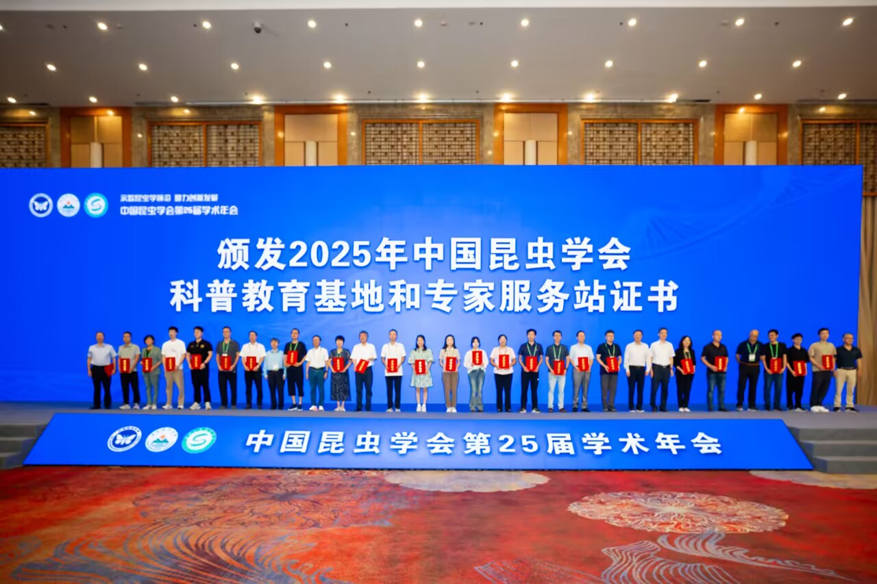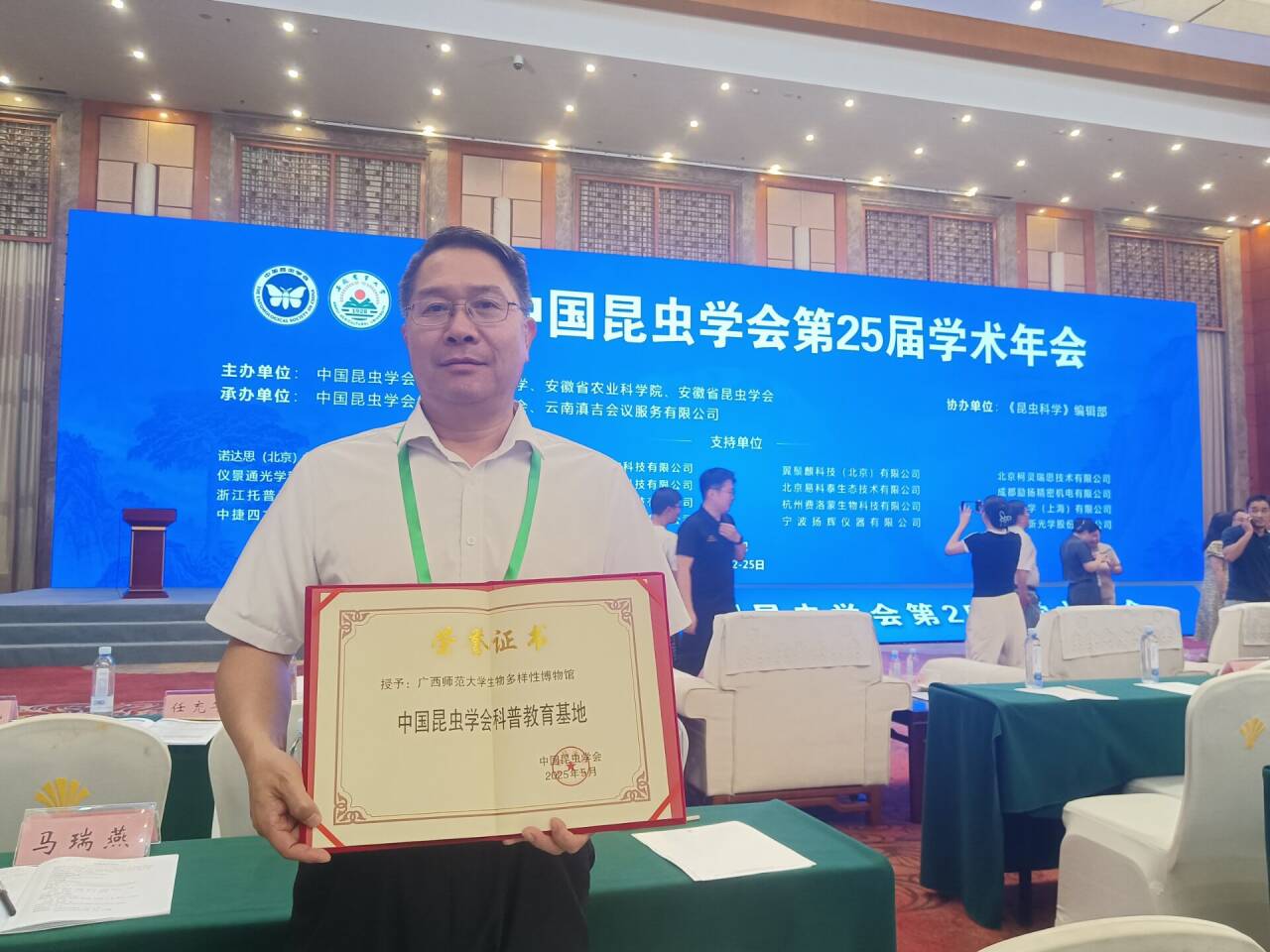 8月22-25日,中国昆虫学会第25届学术年会年在安徽省合肥市成功举办。本次会议以“示踪昆虫学前沿 助力创新发展”为主开展学术报告、座谈会、分组讨论等学术交流活动。会议期间,中国昆虫学会为新认定的科普教育基地颁发证书,各科普基地围绕自身科普工作的进展情况及未来发展规划进行分享交流,共同推动昆虫学科普事业的发展。广西师范大学生物多样性博物馆成功入选“中国昆虫学会科普教育基地”,博物馆馆长邓维安教授参加授牌仪式并领取基地证书。