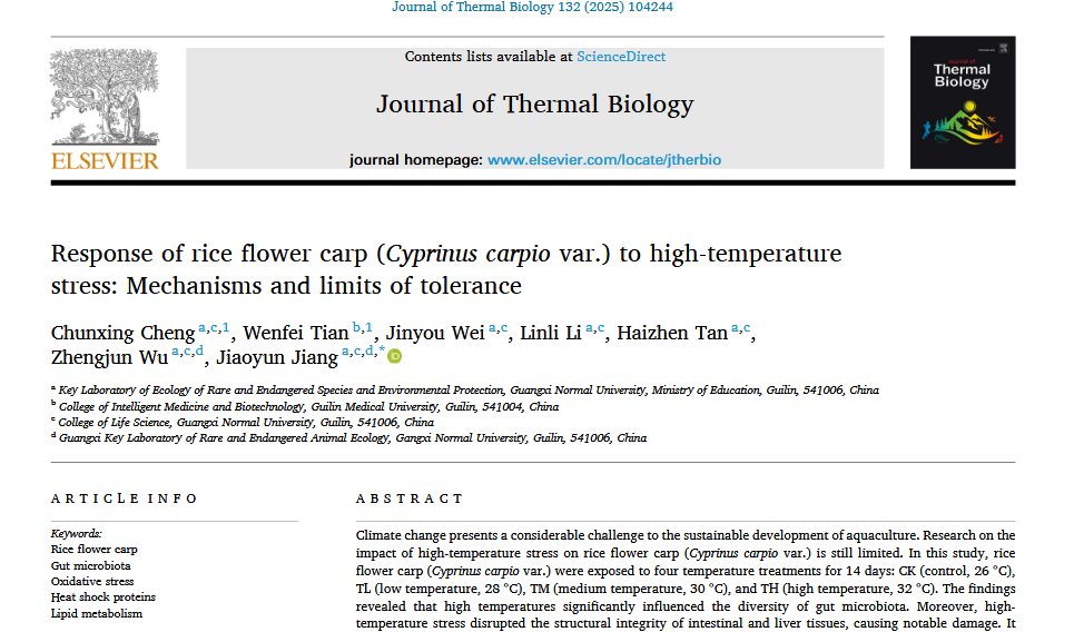 2025年8月22日,相关研究结果以题为“Response of rice flower carp (Cyprinus carpio var.) to high-temperature stress: Mechanisms and limits of tolerance”在国际经典热生物学专刊《Journal of Thermal Biology》(中科院 二区)上发表。论文第一单位为广西师范大学珍稀濒危动植物生态与环境保护教育部重点实验,硕士研究生程春醒为第一作者,硕士研究生韦金友、李林利等为参与作者,蒋骄云副教授为通讯作者。