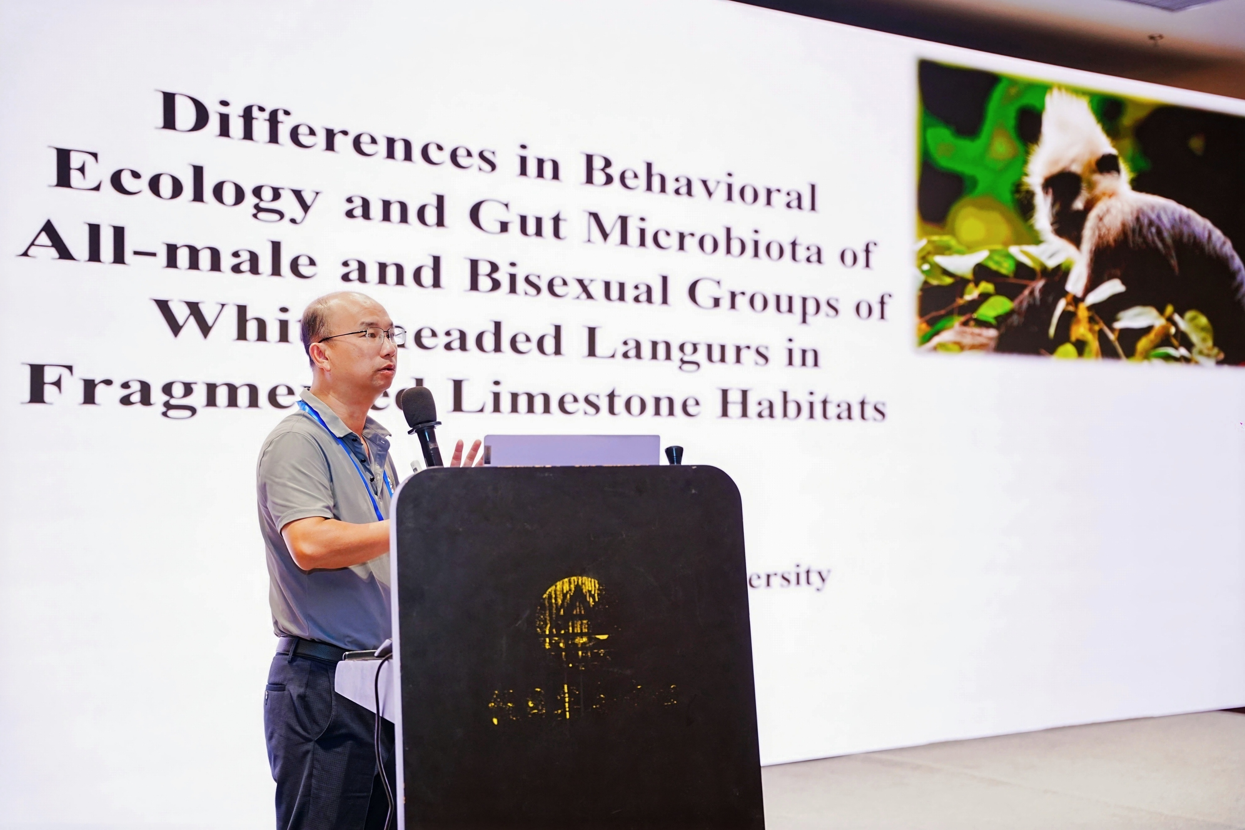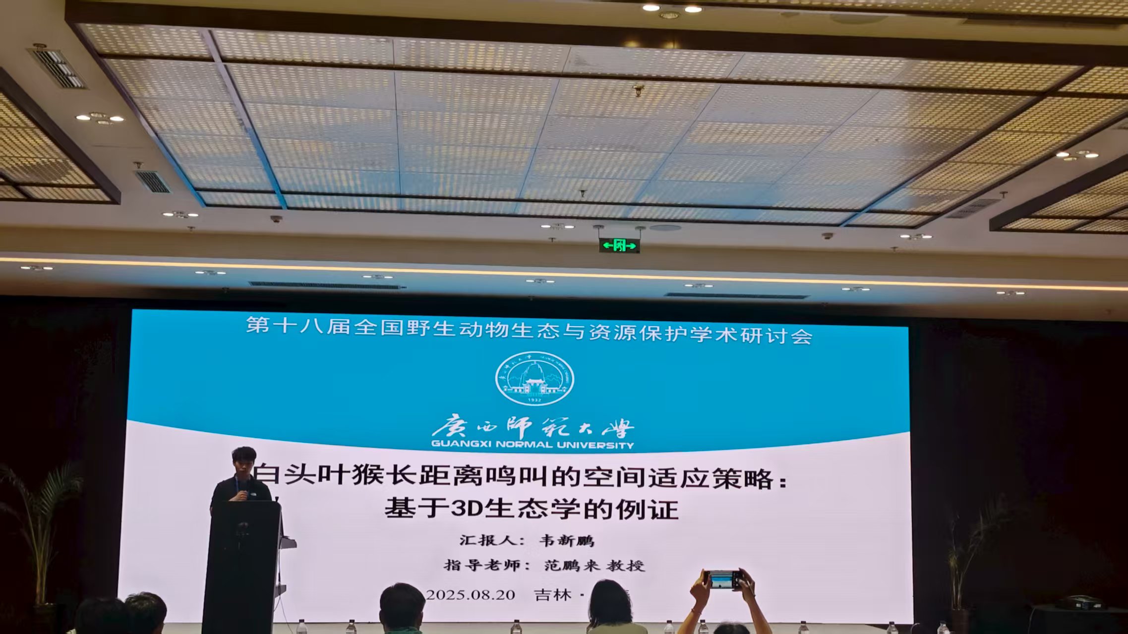 我院周岐海教授、范鹏来教授一行4人参加了此次大会。周岐海老师以《Comparative Behavioral Ecology of All-male and Bisexual Groups of White-headed Langurs in Fragmented Limestone Habitats》在灵长类生态、行为与进化专题进行了报告;2024级生态学硕士韦新鹏《成年雄性白头叶猴长距离鸣叫的空间适应策略:基于3D生态学的例证》在动物生态与行为专题进行了报告;2022级生态学硕士刘银树《Isochronous Rhythms Signal Male-Male Competition in an Asian Langur》在灵长类生态、行为与进化专题进行了报告。我院研究生刘银树同学在本次会议中的学术报告荣获“优秀报告奖”,取得了可喜的成绩。