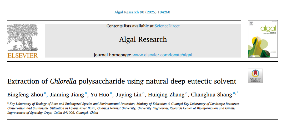 2025年8月11日,尚常花副教授课题组在国际学术期刊《Algal Research》在线发表题为“Extraction of Chlorella polysaccharide using natural deep eutectic solvent”的最新研究成果。2023级生物学硕士研究生周冰凤为第一作者,尚常花副教授为通讯作者。《Algal Research》是藻类学领域中科院大类分区2区期刊,IF=4.5。本论文得到广西自然科学基金面上项目(2024JJA130020)、广西重点研发计划项目(2023AB01132)、广西研究生教育创新计划项目(YCSW2025165)及广西师范大学2024年度国家自然科学基金联合培育项目(2024PY020)的资助。本论文获得珍稀濒危动植物生态与环境保护教育部重点实验室、广西漓江流域景观资源保育与可持续利用重点实验室及特色经济作物生物信息与遗传改良广西高校工程研究中心的支持。