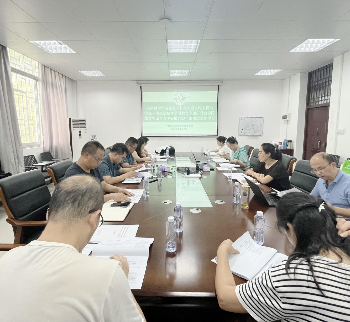 7月7日上午,生命科学学院党委在育才校区国重室2号楼304会议室组织召开党委(扩大)会议深入贯彻中央八项规定精神学习教育专题研讨暨学院党委理论学习中心组2025年第四次集体学习会议。学院领导班子成员、党委委员,教工、学生党支部书记代表参加会议。会议由学院党委主要负责同志主持。