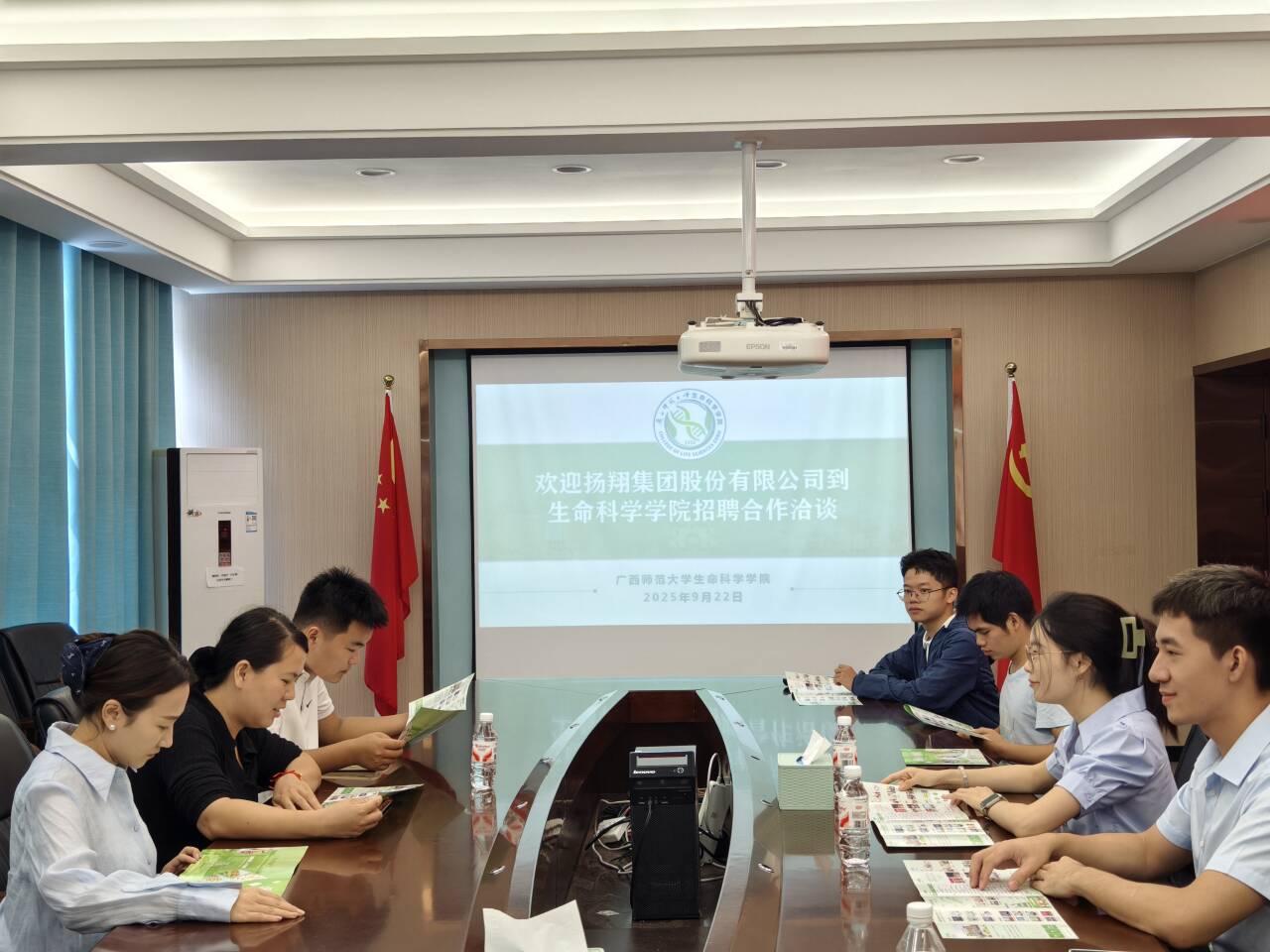 为精准对接用人需求,拓宽就业渠道,推进毕业生高质量就业,9月22日,广西扬翔股份有限公司受邀到访生命科学学院开展校企招聘合作洽谈。学院党委副书记、2026届毕业生辅导员以及毕业生代表参加会议。