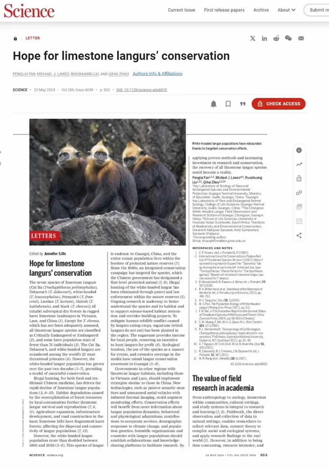依托广西师范大学在灵长类研究领域四十余年来的积累,范鹏来教授与团队系统总结中国政府和科学家拯救极度濒危物种白头叶猴的实证研究和保护经验。在二十多年的野外研究实践中,他们长期深入崇左、弄岗等自然保护区,通过行为观察、声学分析等方法,系统研究灵长类动物对石山环境的适应机制。范鹏来教授与团队还突破传统行为观察的局限,整合“宏观与微观”双维度技术,利用遥感技术精细刻画喀斯特生境的三维结构,结合AI算法破译白头叶猴的通讯密码和行为策略,通过粪便微生物组学技术揭示其内在适应机制。传统方法与创新技术的结合使过去难以量化的科学问题变得可研究。此外,范鹏来教授还重视与国际学者的合作,从多个不同的角度探索科学问题。2024年5月23日,范鹏来教授以第一作者在《科学》(Science)期刊发表题为“Hope for limestone langurs'conservation”(石山叶猴保护的希望)的Letter文章,系统阐述广西白头叶猴保护成效,成为全球石山叶猴保护研究的学界标杆。