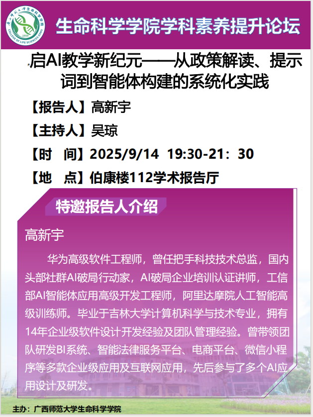 【讲座预告】生命科学学院学科素养提升论坛系列报告会第十四讲:开启AI教学新纪元——从政策解读、提示词到智能体构建的系统化实践