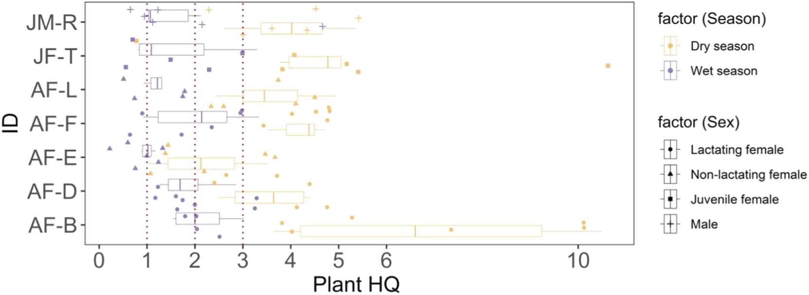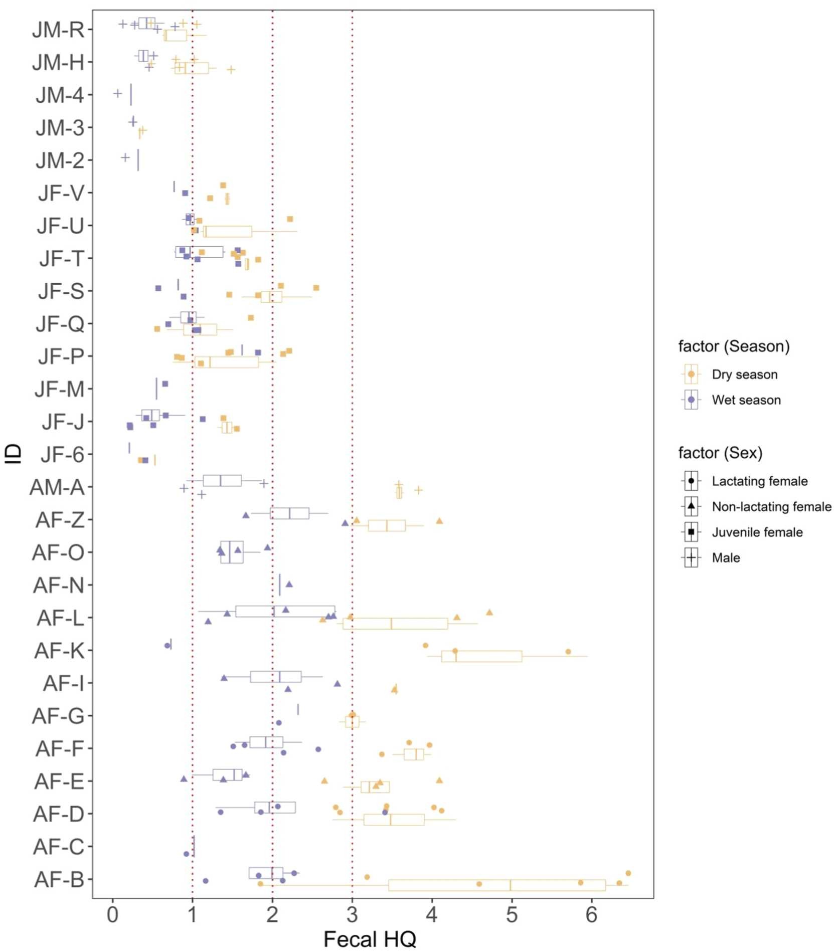 基于分钟级摄食速率估算,猴群日均汞摄入量6.0μg,旱季升至8.5μg;7只个体危害商数HQ均>1,均值3.0,哺乳雌猴与部分幼体HQ>3,进入高风险区间。经粪途径的HQ亦呈现同步的季节性升高。