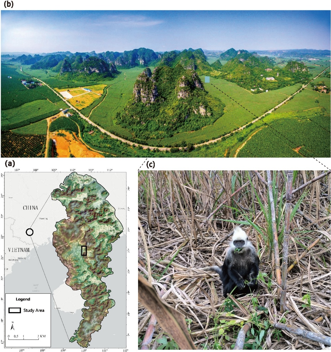 白头叶猴(Trachypithecus leucocephalus)是全球25种最濒危灵长类之一,仅分布于中国西南部的喀斯特地区。森林砍伐使其种群被隔离于一个个孤立的“生境岛屿”,四周被甘蔗、桉树等经济作物环绕。为应对季节性食物短缺,这种以树叶为主食的灵长类会灵活调整觅食策略:旱季会增加对粗纤维食物(如成熟叶)的摄入,并扩大食源范围。值得注意的是,中国西南喀斯特地区位于全球汞矿化带,天然与人为汞源并存,构成了独特的污染风险环境。前期监测发现,白头叶猴主要在植被丰富但靠近农田和城镇的破碎化山麓、山坡地带觅食,在过渡区的活动时间增加了近三分之一,这虽反映了反盗猎、植被恢复等保护措施的成效,但也可能显著增加其暴露于农业和城镇污染物的风险。