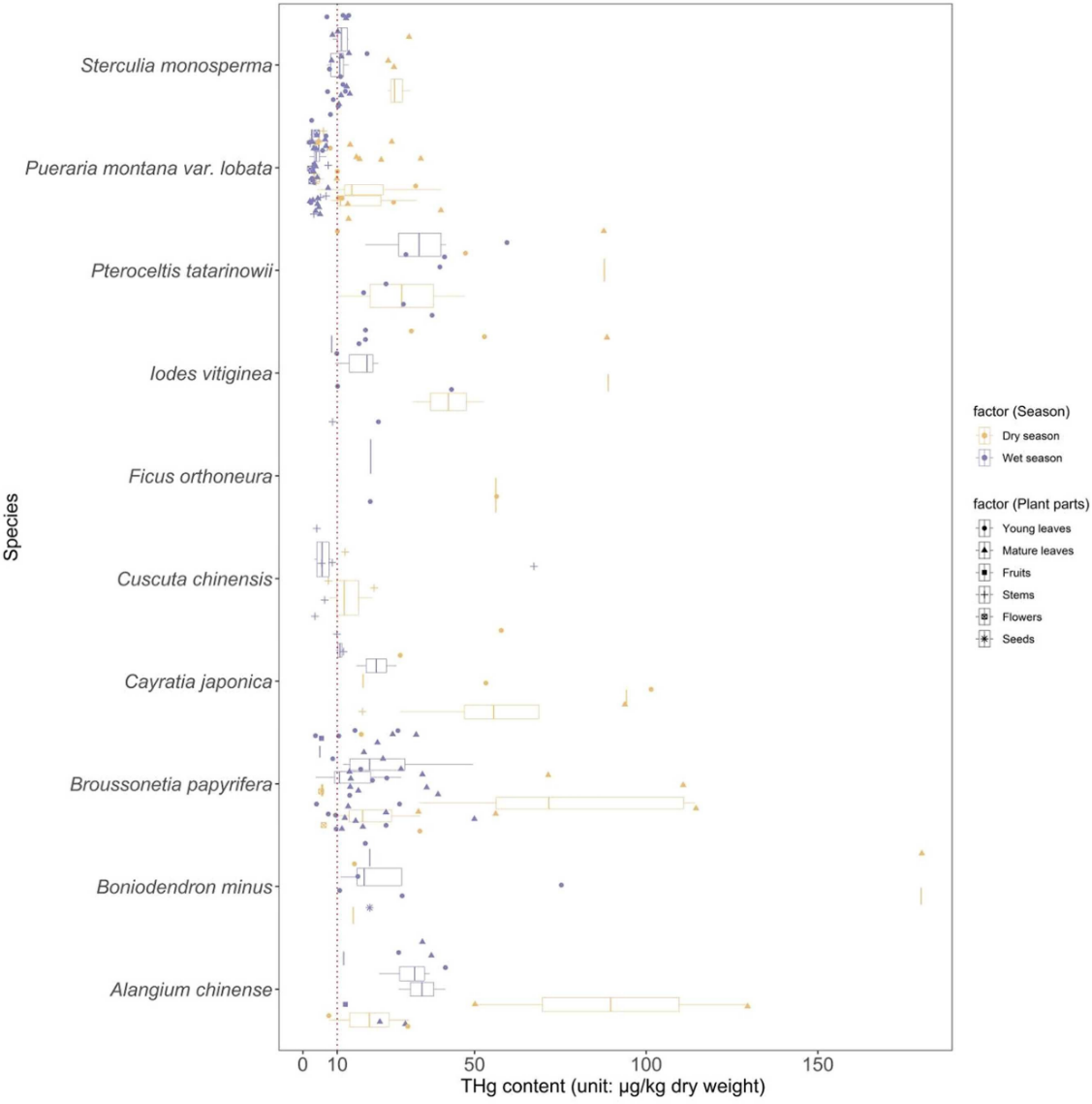 图3 白头叶猴前10种食源植物中的总汞含量(红色虚线代表中国蔬菜及其制品的限量标准(10 μg/kg))