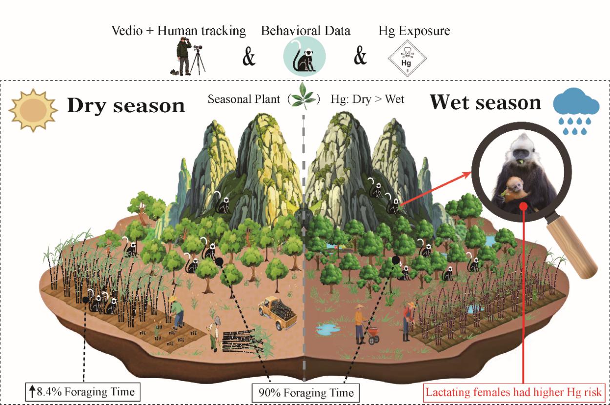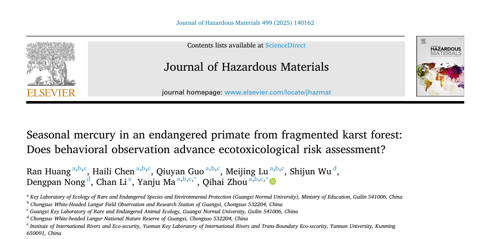 相关研究成果以题目为“Seasonal mercury in an endangered primate from fragmented karst forest: Does behavioral observation advance ecotoxicological risk assessment?”发表在《Journal of Hazardous Materials》(中科院一区TOP期刊, JCR1区, 五年影响因子12.4)上。广西师范大学硕士生黄然为论文第一作者,广西师范大学生命科学学院周岐海教授、马艳菊副教授为共同通讯作者。本研究得到了国家自然科学基金(32301458、32170492),广西中青年教师基本能力提升计划(2023KY0066)、以及广西科技基地和人才专项项目(AD23026102)的资助,该研究还得到广西师范大学珍稀濒危动植物生态与环境保护教育部重点实验室、广西崇左白头叶猴野外科学观测站的支持。