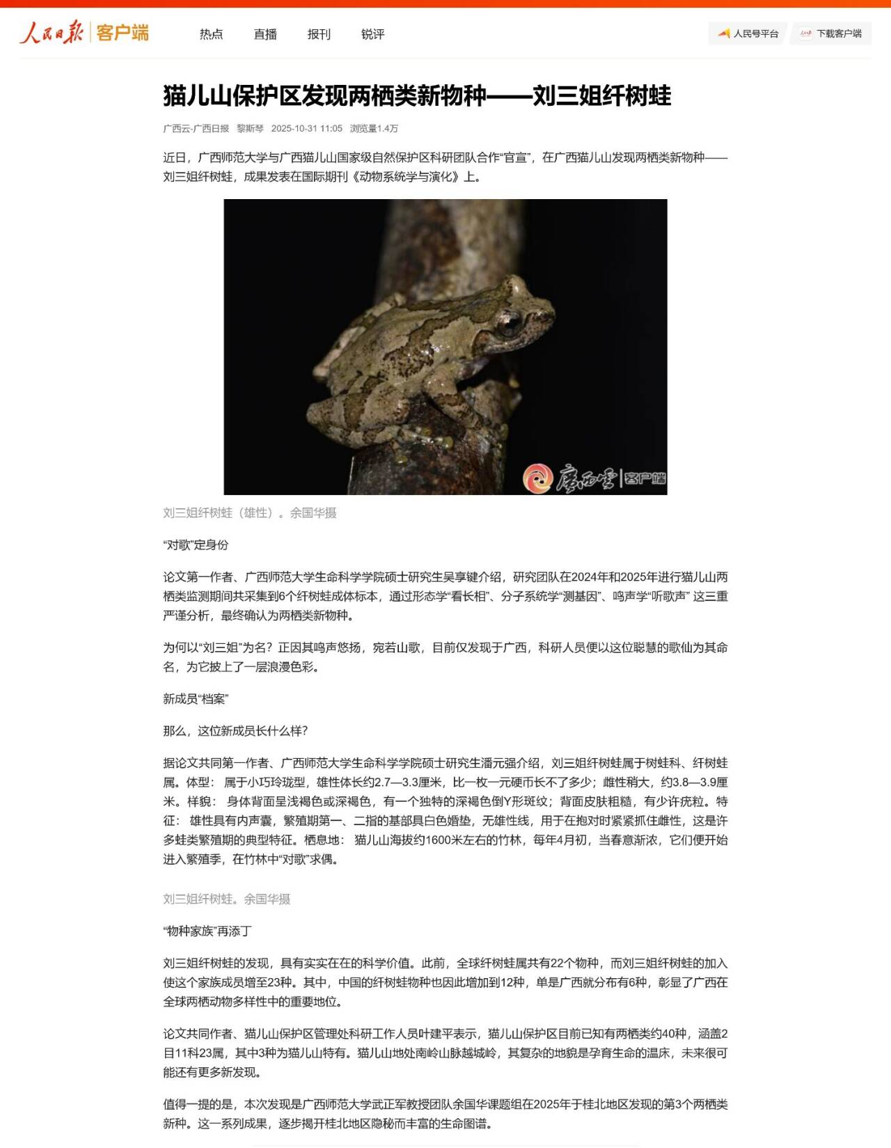 近日,《人民日报》、广西云客户端等媒体平台关注报道我校与广西猫儿山国家级自然保护区科研团队合作的重要科研成果——在广西猫儿山发现两栖类新物种“刘三姐纤树蛙”,该成果已正式发表在国际期刊《动物系统学与演化》上,进一步揭开了桂北地区隐秘的生物多样性面纱。