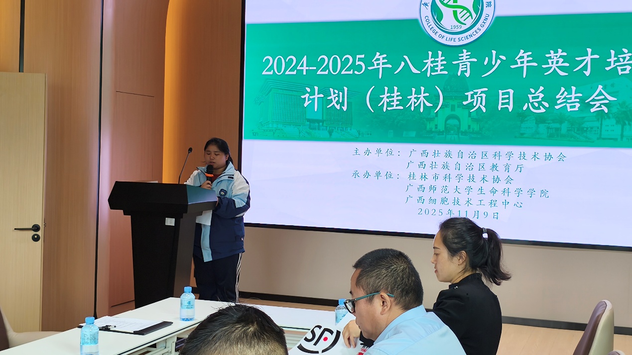 项目主持人吴琼在总结发言中,对项目实施情况进行了全面回顾。她介绍,本学年项目构建了 “理论—实践—创新” 三位一体的课程体系,累计开展 6 次集中理论学习和 30 余次分学科实验课,有效提升了学员的科技素养与竞赛能力。据悉,项目学员在各类科技赛事中表现亮眼,2 位同学代表广西参与全国 “中学生英才计划” 学科交流,多名学员在广西化学、生物、物理奥赛中斩获佳绩,在校级科技活动中也屡获殊荣。吴琼表示,这些成绩的取得离不开自治区及桂林市科协的资源投入、导师团队的辛勤付出以及各中学的紧密配合。她寄语全体学员,要以此次项目为起点,永葆科学探索的好奇心与坚韧心,在未来的道路上勇攀高峰,并期待与各中学深化合作,完善高校与中学联合培养科技创新后备人才的长效机制。