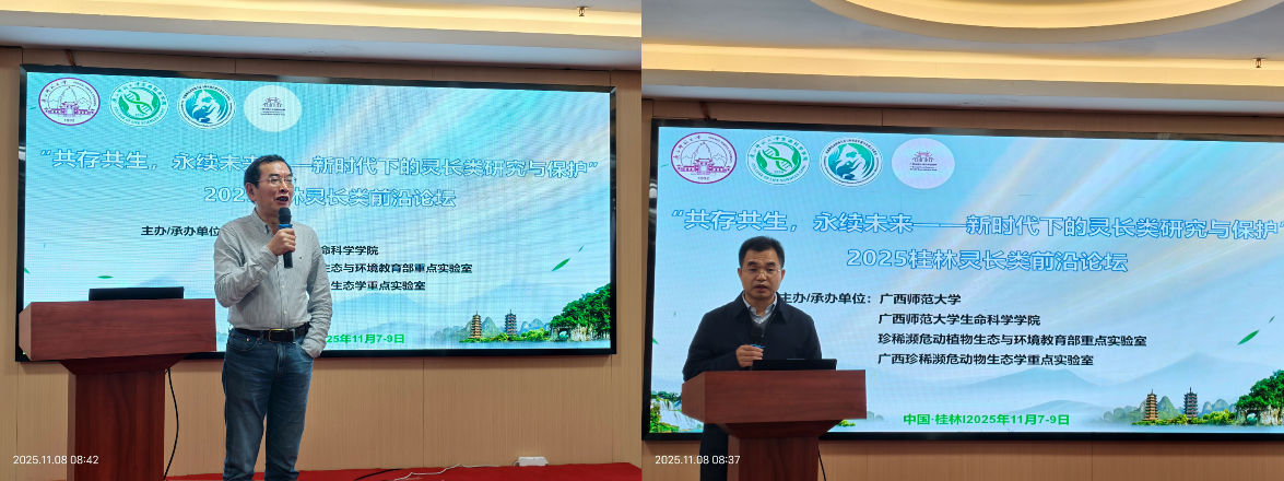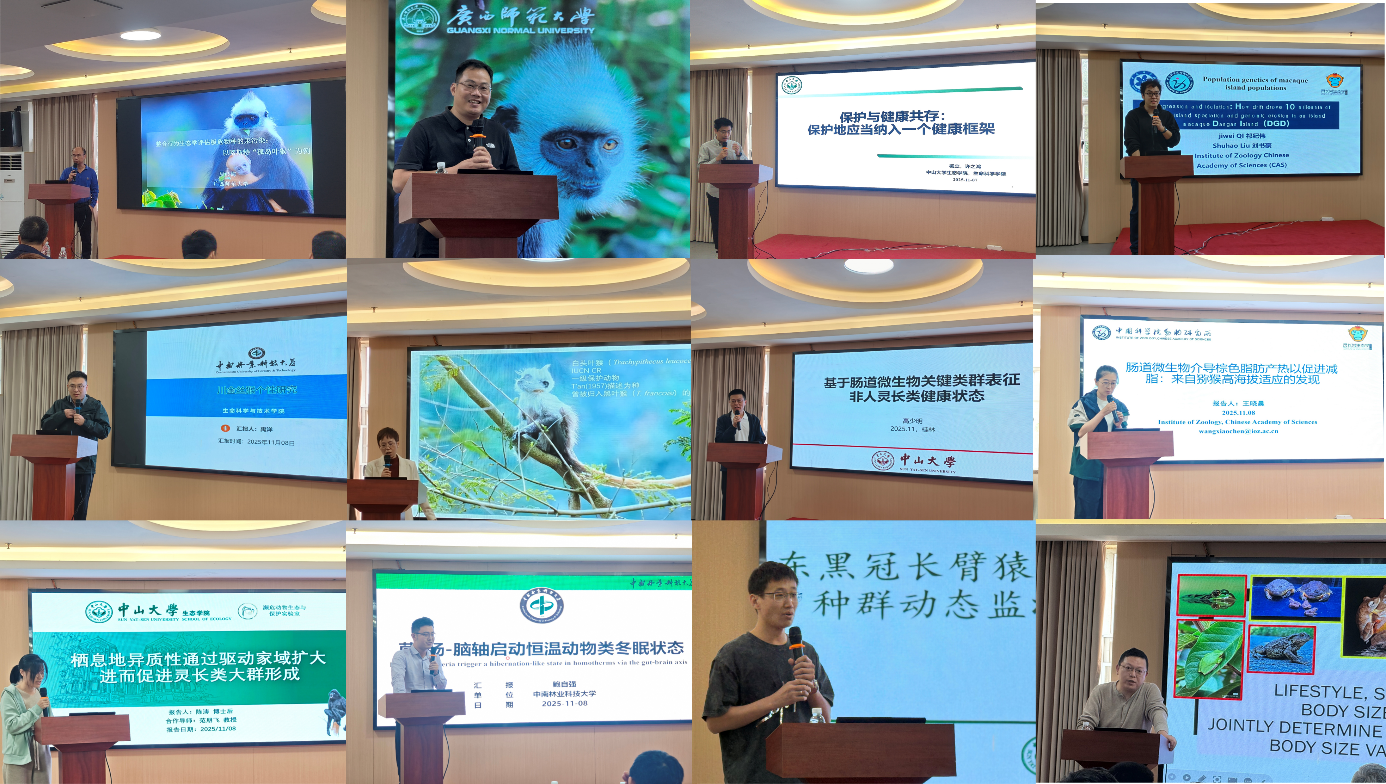 2025年11月7日至10日,"漓江生态与保护论坛——灵长类学术前沿研讨会"在桂林伏波江景漓江边度假酒店成功举办。本次会议由广西师范大学生命科学学院、珍稀濒危动植物生态与环境保护教育部重点实验室、广西崇左白头叶猴野外科学观测研究站及广西珍稀濒危动物生态学重点实验室联合主办。