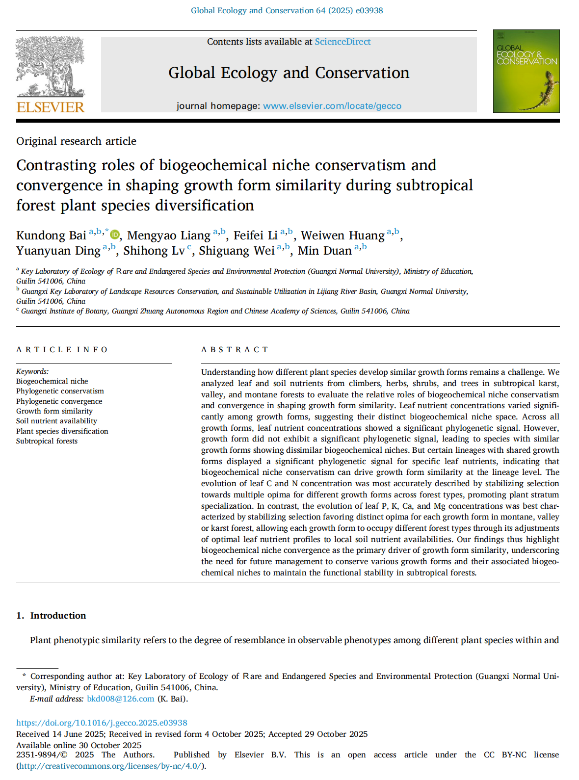 相关研究结果以“Contrasting roles of biogeochemical niche conservatism and convergence in shaping growth form similarity during subtropical forest plant species diversification”为题在中科院环境科学与生态学二区高水平期刊《Global Ecology and Conservation》上发表(JCRQ1,IF5year=4.3)。论文第一单位为广西师范大学珍稀濒危动植物生态与环境保护教育部重点实验室,我院白坤栋研究员为第一作者和通讯作者,该研究获得了国家自然科学基金(31960241)的资助。