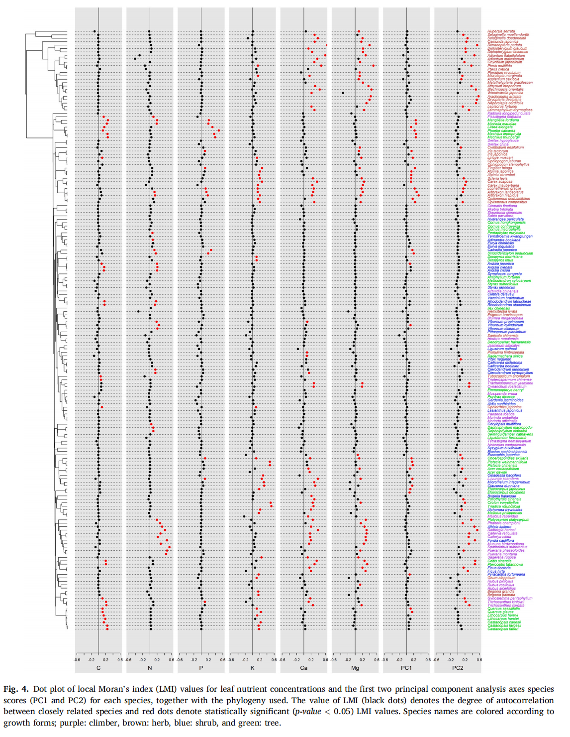 在植物物种多样化进程中,驱动生长型相似性形成的生态进化机制一直是生态学领域长期存在的挑战。本研究通过分析亚热带喀斯特、河谷和山地森林中藤本植物、草本植物、灌木和乔木的叶片与土壤养分,评估生物地球化学生态位保守性和趋同性在塑造生长型相似性中的相对作用。研究结果显示,不同生长型之间的叶片养分含量存在显著差异,表明它们占据独特的生物地球化学生态位空间。在所有生长型中,叶片养分含量均表现出显著的系统发育信号。然而,生长型本身并未表现出显著的系统发育信号,这导致具有相似生长型的物种反而表现出不同的生物地球化学生态位,但部分具有相同生长型的谱系,其特定叶片养分呈现出显著的系统发育信号,这表明生物地球化学生态位保守性可在谱系水平上驱动生长型相似性的形成。叶片碳(C)和氮(N)含量的演化,最符合“不同森林类型中各生长型向多个最适值趋稳选择”的模式,这一过程促进了森林植物群落的层次分化。相比之下,叶片磷(P)、钾(K)、钙(Ca)和镁(Mg)含量的演化特征最显著地表现为稳定选择作用——这种选择机制促使山地、河谷或喀斯特森林中不同生长型分别形成独特的养分最优配置,使得生长型得以占据不同的森林生境。本研究结果表明,生物地球化学生态位趋同性是生长型相似性的主要驱动因素,未来的生态管理需保护多样的植物生长型及其相关的生物地球化学生态位,以维持亚热带森林的功能稳定性。