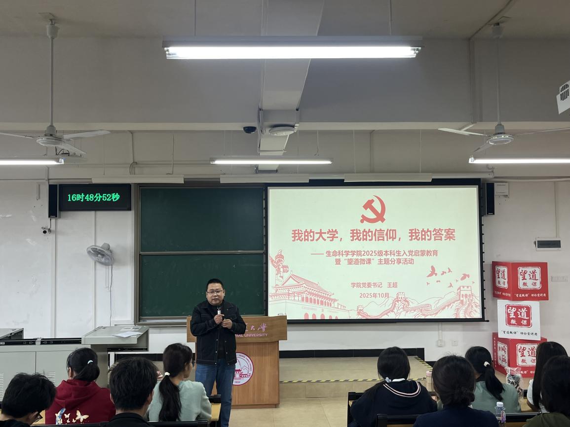 为坚定学生理想信念,加深对党的光辉历程与伟大成就的认识,10月23日、11月13日,生命科学学院连续开展2场“我的大学、我的信仰、我的答案”新生入党启蒙教育暨“望道微课”。学院党委主要负责同志主讲,全体2025级本科新生分批参与。