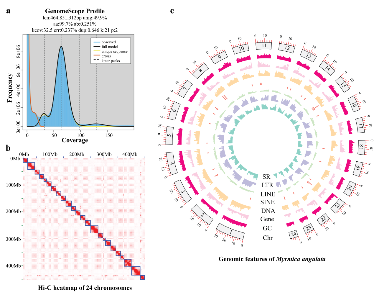 题组整合 PacBio 三代测序、Illumina 二代测序及 Hi-C 染色体构象捕获技术,首次完成弯角红蚁(Myrmica angulata)的染色体水平基因组组装。该物种基因组大小为 464.36 Mb,97.36% 的序列成功锚定至 24 条假染色体,contig N50 达 1.752 Mb,BUSCO 完整性高达 98.5%;通过基因组注释,共获得 17,066 个蛋白质编码基因及 1,036 个非编码 RNA。高质量基因组图谱的构建,不仅为解析红蚁属高纬度、高海拔环境的遗传适应机制提供了分子基础,也为蚂蚁适应性进化的整体研究补充了重要参考数据。
