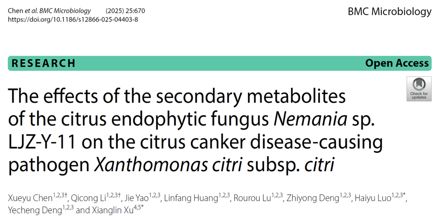 2025年10月21日,研究结果以题为“The effects of the secondary metabolites of the citrus endophytic fungus Nemania sp. LJZ-Y-11 on the citrus canker disease-causing pathogen Xanthomonas citri subsp. citri”在线发表在国际学术期刊《BMC Microbiology》(二区)。我院已毕业硕士研究生陈雪玉(2022级生物学)和李奇聪(2020级林业)为共同第一作者。本研究工作得到广西重点研发计划项目(桂科AB22080071;AB21196065)、广西自然科学基金面上项目(2018GXNSFAA281013)等资助。