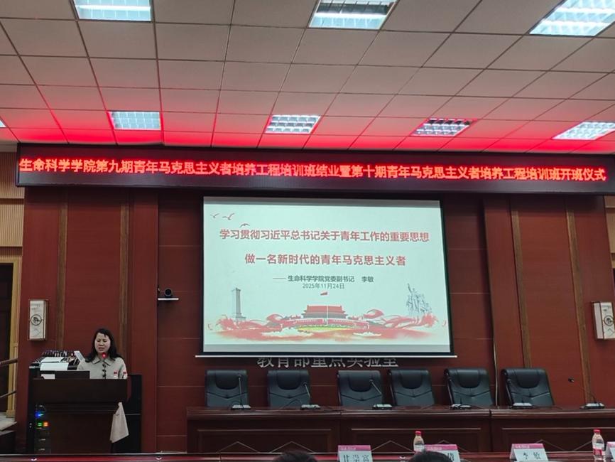 为深入学习贯彻习近平新时代中国特色社会主义思想,着力培养有理想、敢担当、能吃苦、肯奋斗的新时代青年马克思主义者,11月24日下午,生命科学学院第九期青年马克思主义者培养工程培训班结业暨第十期青年马克思主义者培养工程培训班开班仪式在伯康楼112报告厅举行。学院分管学生工作负责人、团委负责人、辅导员代表以及两期青马班全体学员共同参加本次活动。