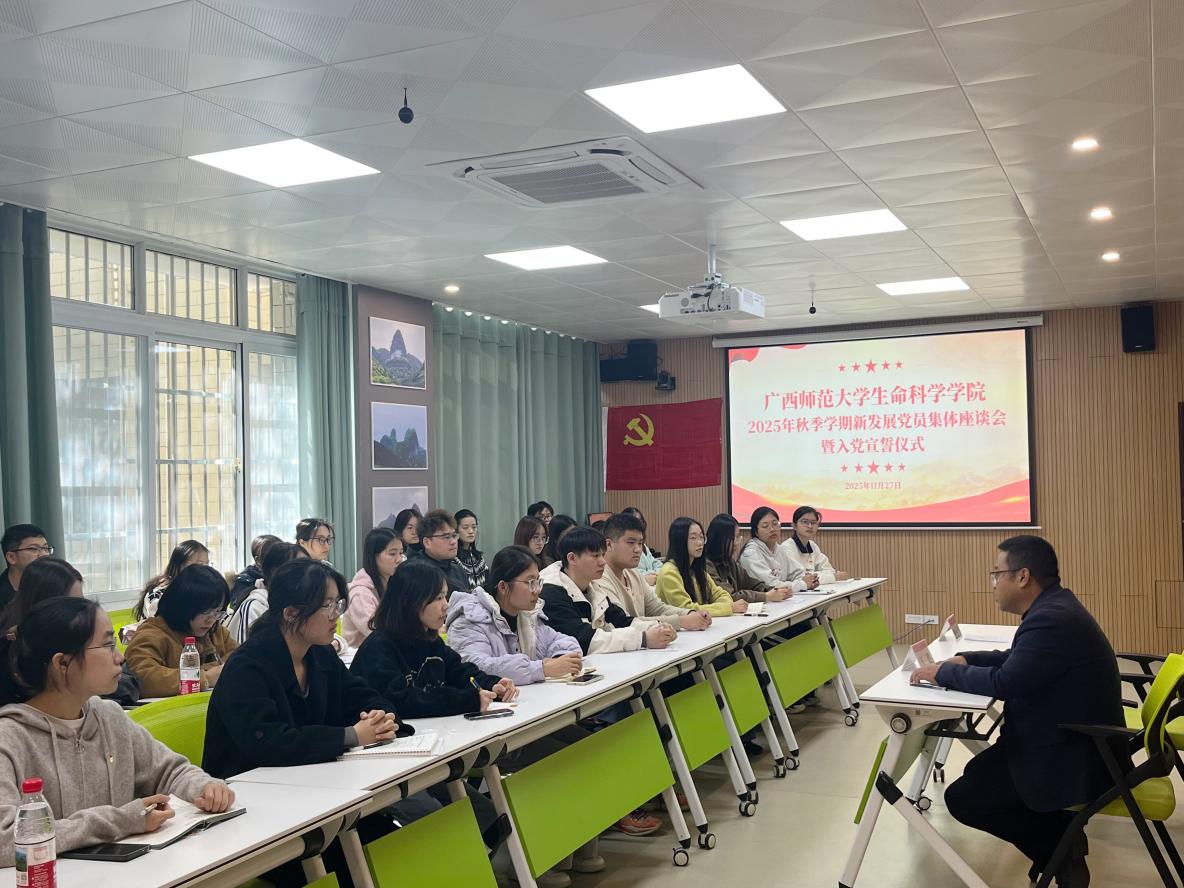 为切实强化党性教育,增强新发展党员组织归属感和身份认同感,厚植责任意识与使命担当,11月27日,生命科学学院党委在雁山校区厚藩楼理科组团124会议室开展2025年秋季学期新发展党员集体谈话暨入党宣誓仪式,学院党委主要负责同志、专职组织员与2025年秋季学期38名新发展党员共同参加此次活动。