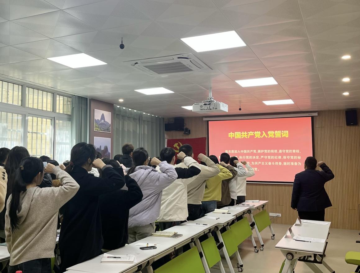 宣誓仪式在庄严的国歌声中开始。面对鲜红党旗,全体新党员举起右拳庄严宣誓,许下了为共产主义奋斗终身的铮铮誓言。