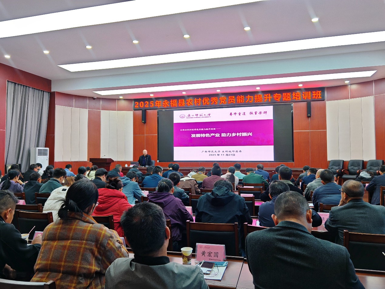 2025年11月27日,全国岗位学雷锋标兵、桂林市劳模和工匠人才创新工作室领衔人、广西师范大学生命科学学院二级教授邓荫伟,受邀为永福县农村优秀党员能力提升专题培训班授课。110名扎根基层一线的农村优秀党员齐聚一堂,认真聆听题为《发展特色产业助力乡村振兴》的专题讲座。整场培训既有理论政策的高度指引,又有产业实践的鲜活案例,干货满满、直击需求。课后,党员们争相添加邓教授微信请求“长效指导”,成为培训中一道暖心又务实的风景线。