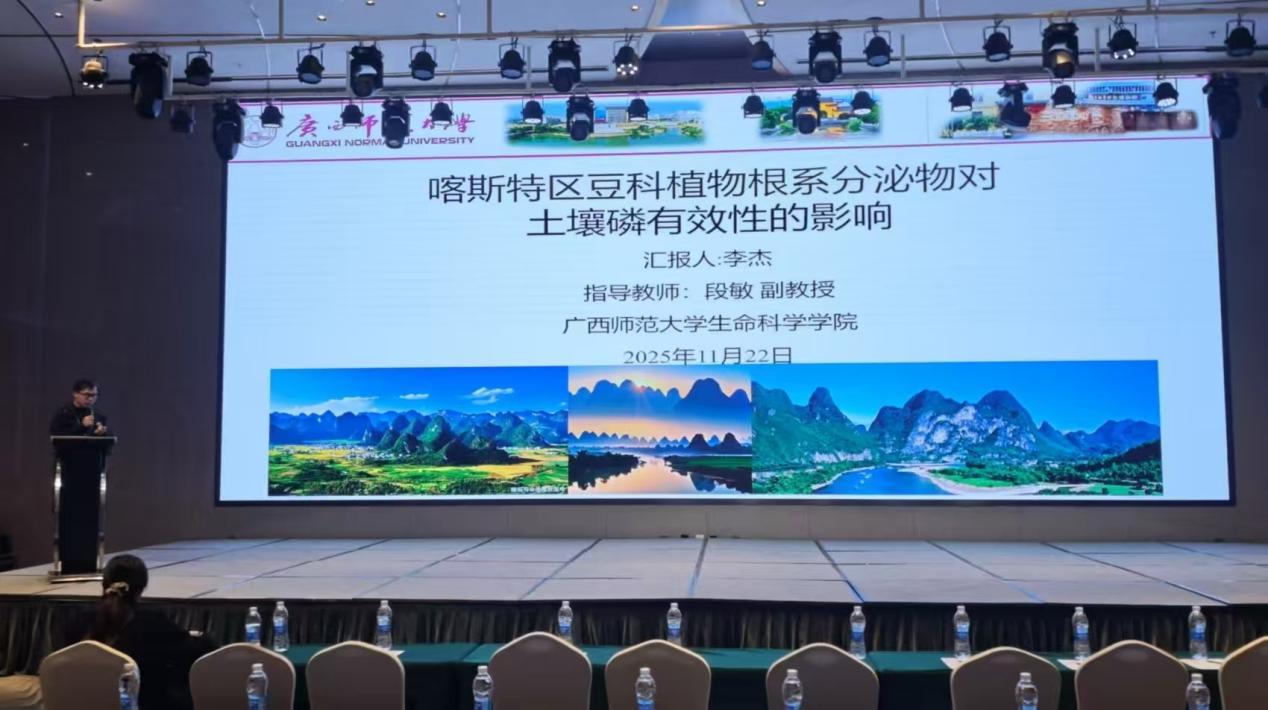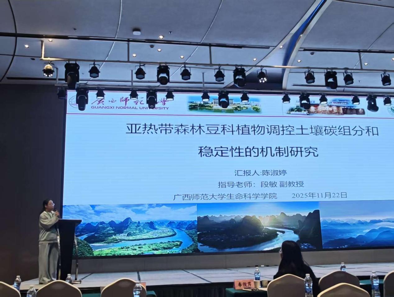 会议期间,重点实验室马姜明教授课题组2024级生态学专业硕士研究生李乐玮、段敏副教授课题组2023级生态学专业研究生李杰和2024级林业专业研究生陈淑婷分别以《中国南方喀斯特地区水分利用效率及其组分的时空变化和影响因素》《喀斯特区豆科植物根系分泌物对土壤磷有效性的影响》《亚热带森林豆科植物调控土壤碳组分和稳定性的机制研究》为题在研究生论坛上作口头汇报。