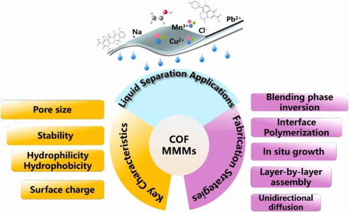 共价有机框架(COFs)作为一类结晶多孔聚合物,凭借规则的孔结构、高比表面积和可调控功能等特性,已成为膜分离技术中的新型功能材料。将 COFs 作为填料与聚合物基质复合形成混合基质膜(MMMs),可实现渗透性、选择性与化学稳定性的协同提升,为液相间高效分离提供了创新解决方案。这类复合膜在水资源净化、溶剂回收等领域展现出巨大应用潜力,尤其在解决传统聚合物膜选择性不足、渗透性有限等瓶颈问题上具有显著优势。