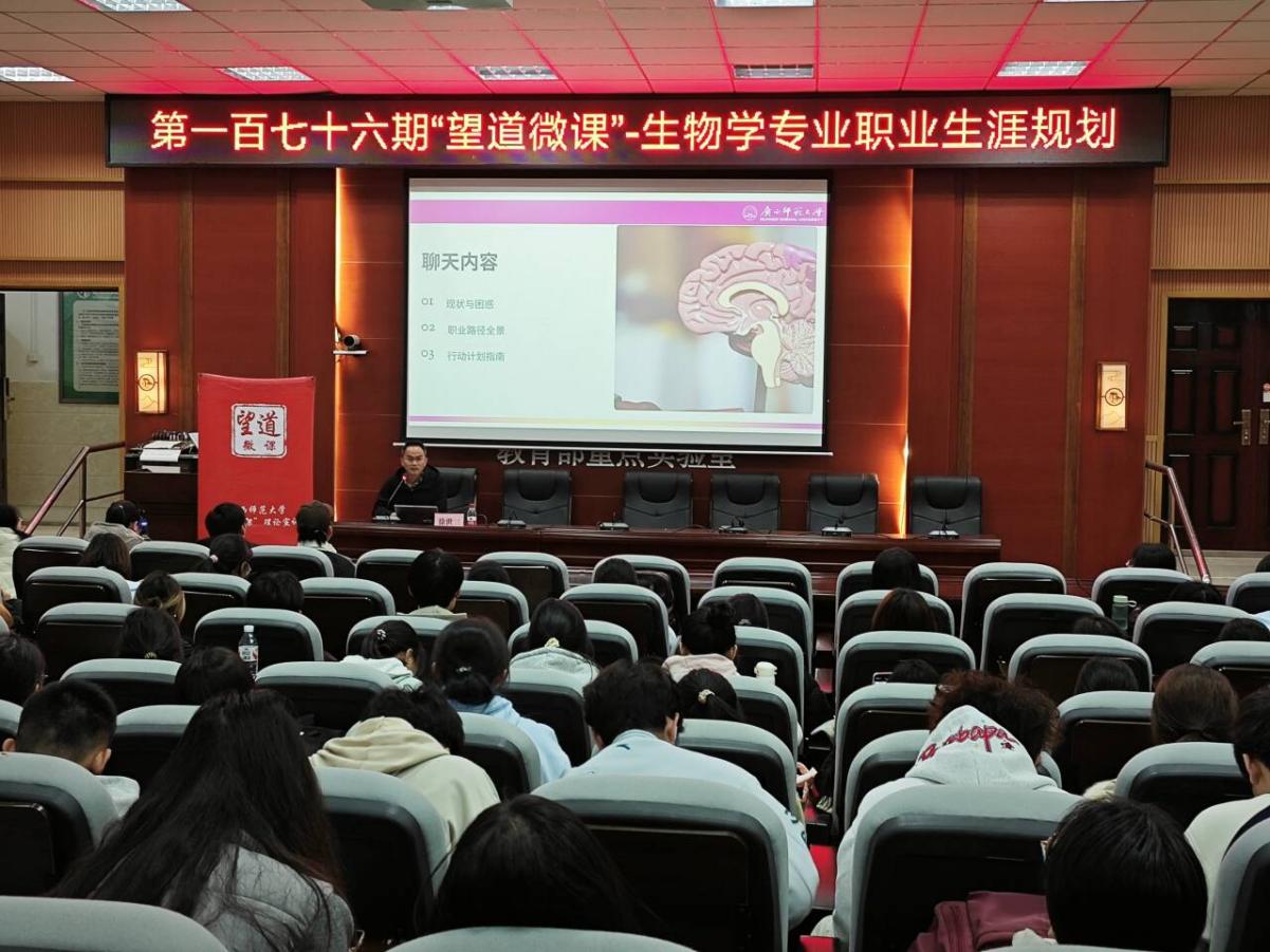 为破解就业困惑、明晰成长路径,12月3日,由我院承办的第一百七十六期“望道微课”理论宣讲生物学专业职业生涯规划专题讲座在雁山校区伯康楼112报告厅举行。本次讲座邀请徐世三副教授担任主讲,100余名2025级本科生、研究生代表参与讲座。