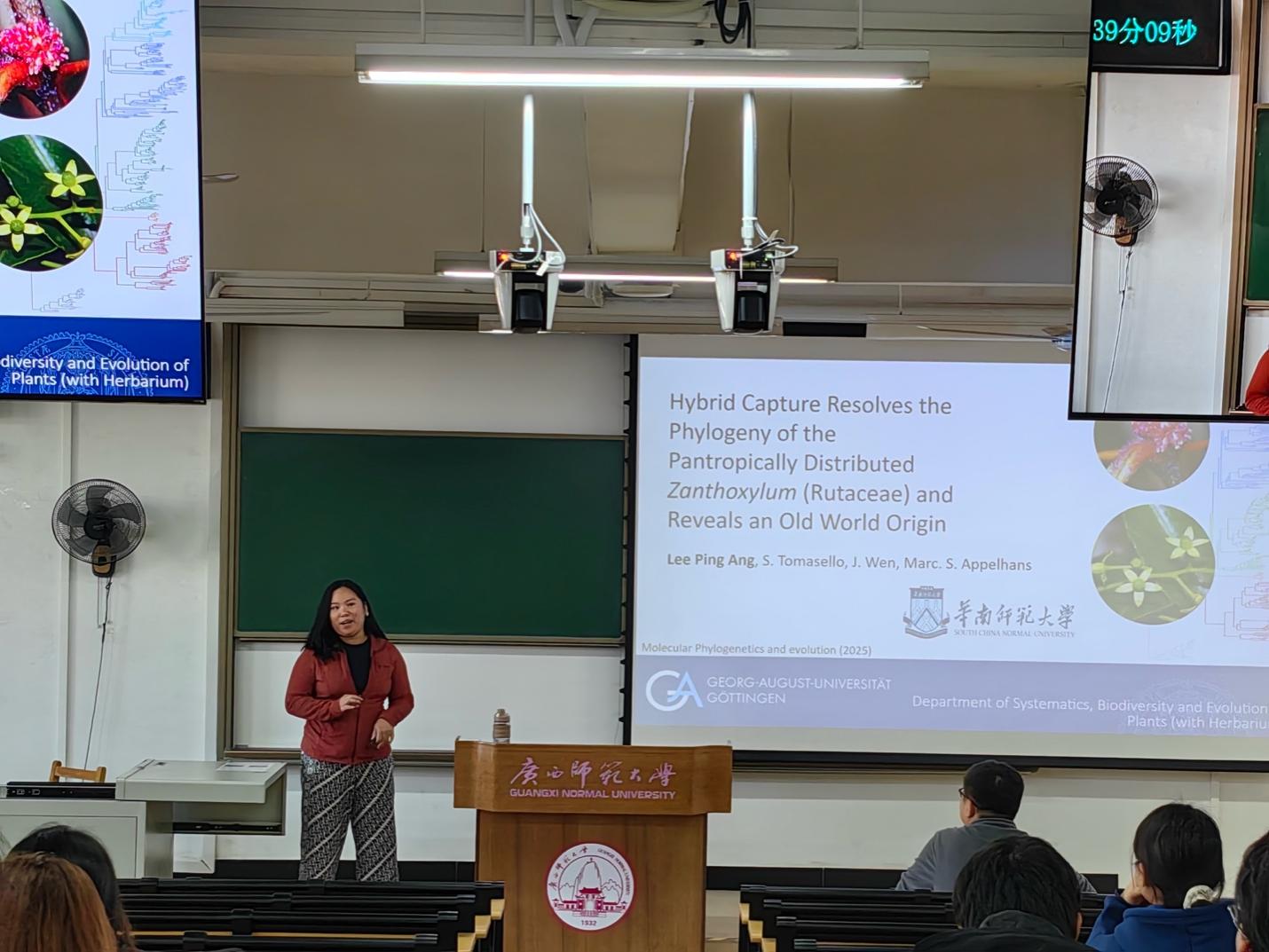 Lee Ping Ang 博士主要从事热带植物生态、系统发育与生物地理研究。她的报告围绕花椒属(Zanthoxylum, Rutaceae)的系统发育与历史生物地理展开,利用杂交捕获技术获取的大规模基因组数据,构建了目前最为全面的花椒属系统发育树,解决了多项长期存在的分类学争议,并有力支持花椒属起源于旧大陆的观点。相关研究加深了对花椒属物种多样化和洲际扩散历史的认识,为热带植物进化研究和生物多样性保护提供了重要参考。