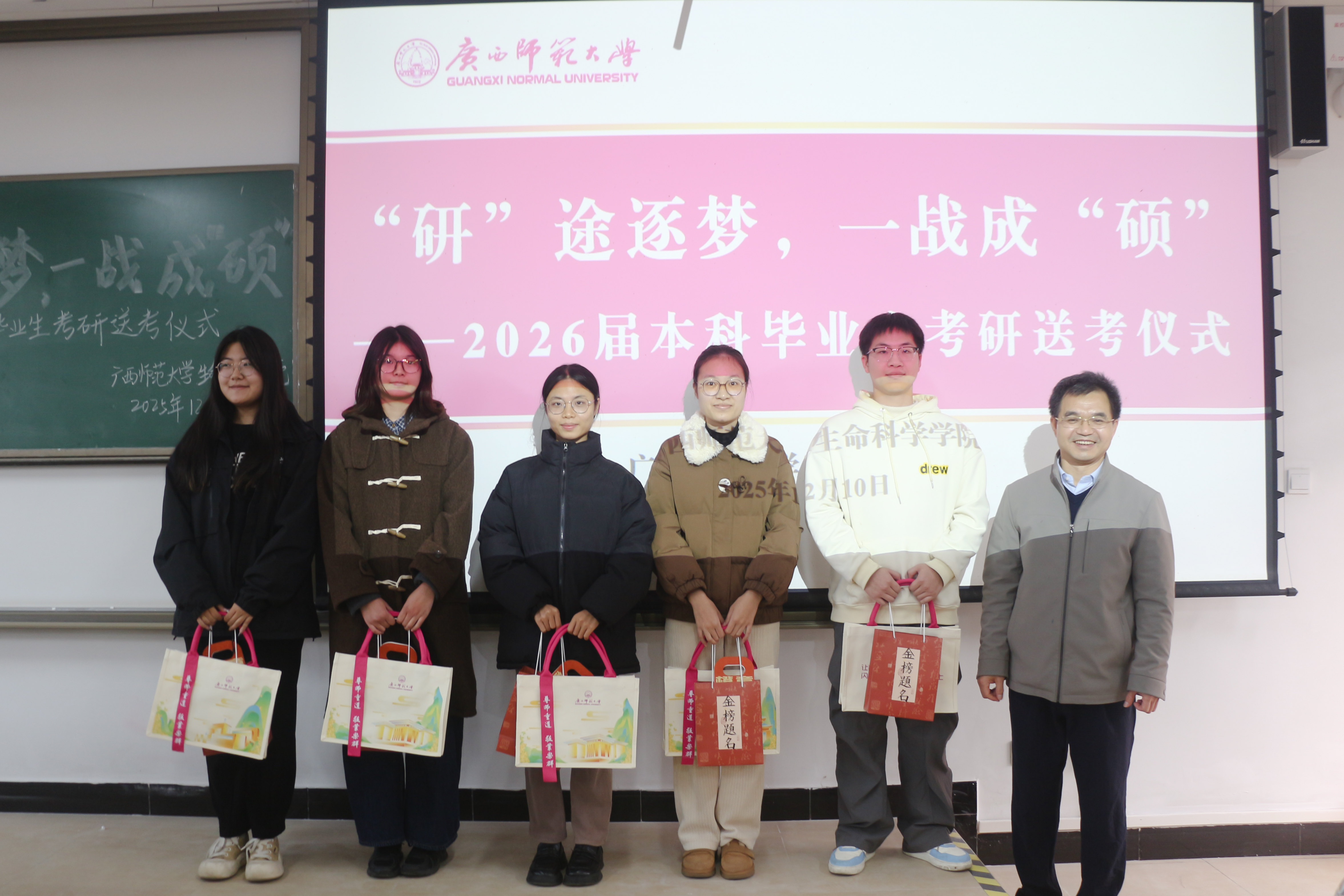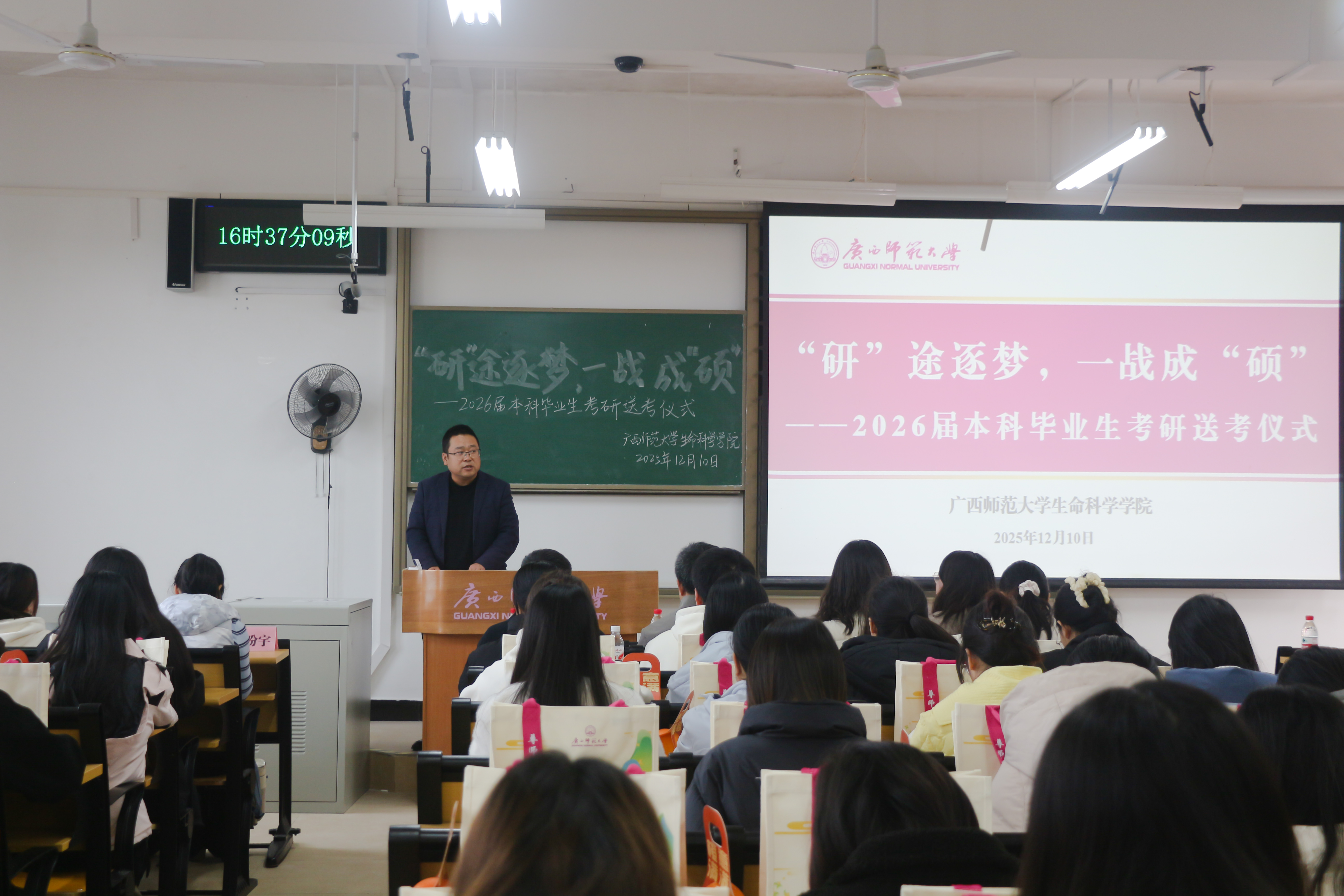 为鼓舞考研学生士气,坚定备考信心,营造温暖向上的育人氛围,12月10日,生命科学学院举行“‘研’途逐梦 一站成‘硕’”2026届本科毕业生考研送考仪式。学院党委书记、院长、分管学生工作副书记、全体毕业班班主任及专兼职辅导员参加送考仪式,为考研学子送上学院的殷切关怀与诚挚祝福。
