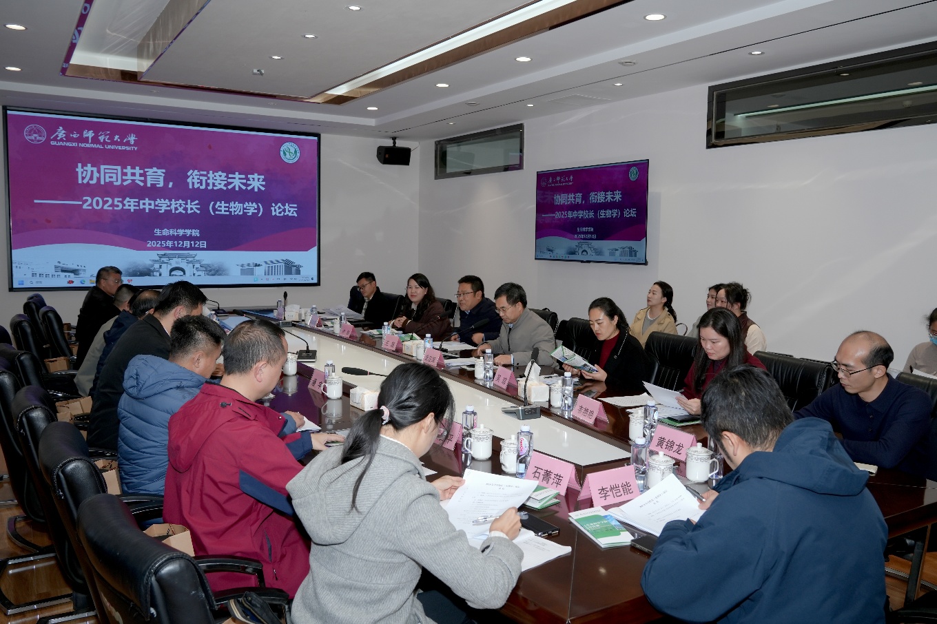 12月12日下午,生命科学学院在育才校区文科中心三楼会议室举办“协同共育,衔接未来——2025年中学校长(生物学)”论坛。本次论坛紧扣生物科学师范专业人才培养与就业衔接、学院“十五五”事业发展规划两大核心议题展开深入研讨。桂林市教育科学研究所教研员,桂林市第一中学、第八中学、第十八中学,桂林市中山中学、田家炳中学、桂林中学、桂林市卓然学校等多所中学的党委书记、校长、副校长等应邀出席论坛;生命科学学院领导班子、院长助理、学科教学论专业教师和毕业班辅导员代表等参加论坛。论坛由生命科学学院行政主要负责同志主持。
