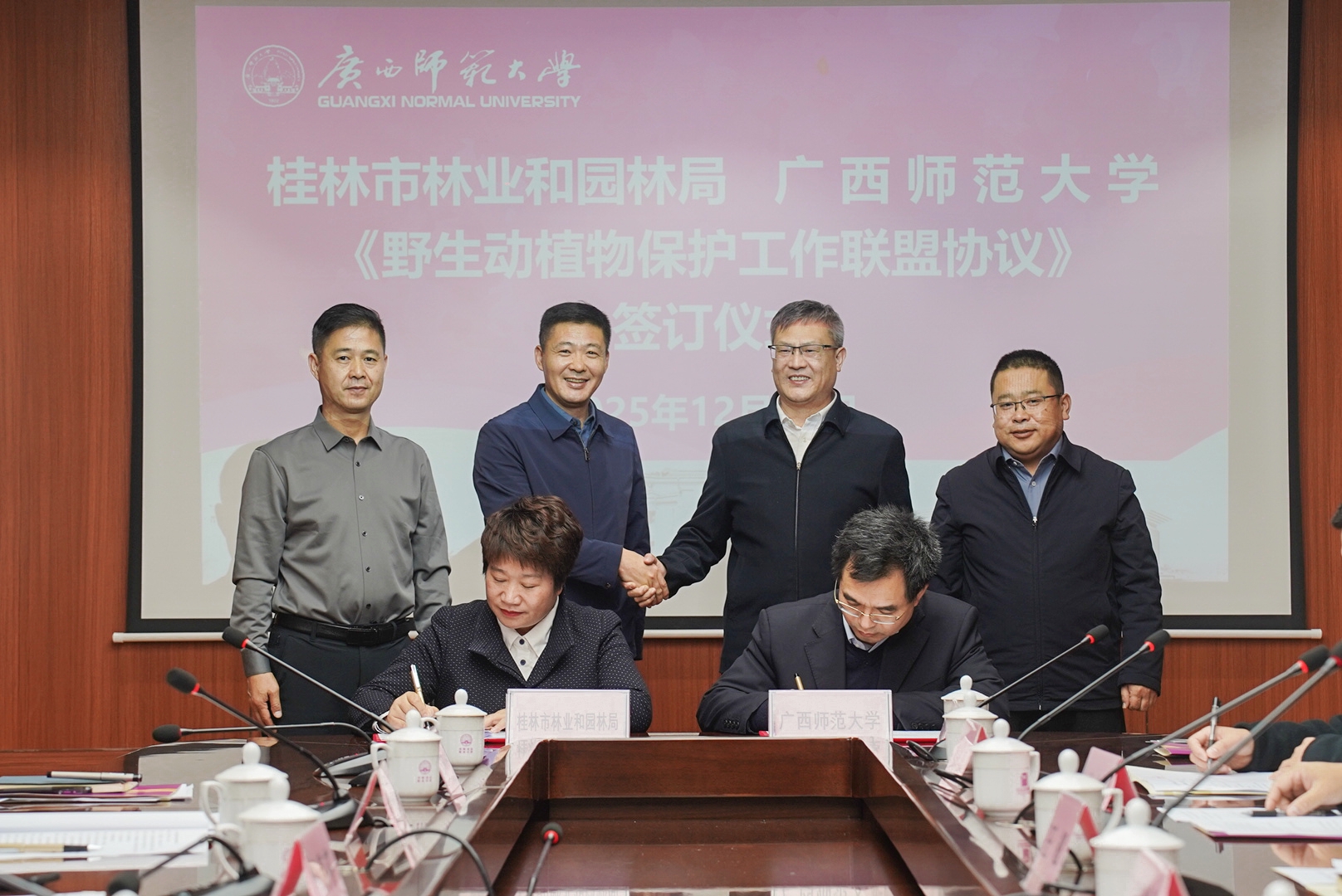12月19日下午,生命科学学院代表学校与桂林市林业和园林局在育才校区国教中心2号楼211会议室签订野生动植物保护工作联盟协议并座谈。桂林市委常委、副市长陈国富,广西师范大学党委常委、副校长宋树祥出席活动并讲话。签约仪式由学院分管科研工作副院长主持。