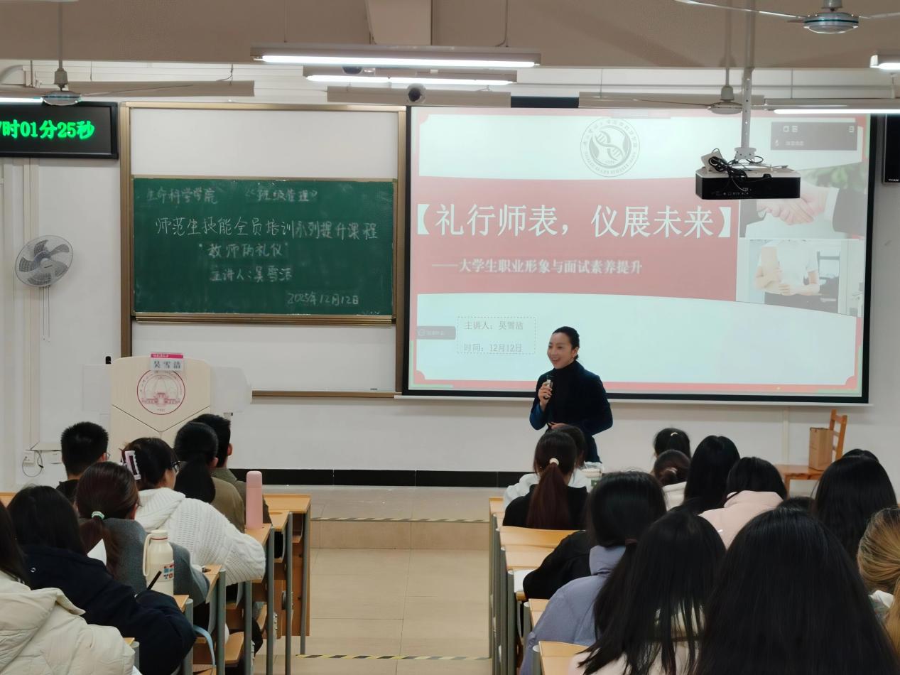 为着力增强师范生职业素养与就业综合能力,12月12日下午,生命科学学院在理4-401举办“礼行师表,仪展未来”——大学生职业形象与面试素养提升专题讲座。本次讲座邀请教育部CVCC高级政务礼仪指导师吴雪洁老师主讲,2023级生物科学专业共计250余学生参加。