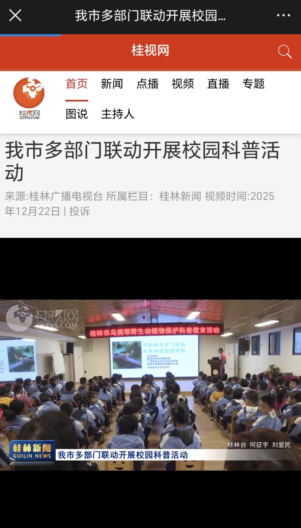 12月18日,桂林广播电视台以《我市多部门联动开展校园科普活动》为题,关注报道我院参与的“守护候鸟迁飞通道,共享和谐美丽家园”主题科普教育活动。视频中介绍,活动通过“分龄科普、知行合一”的模式,以讲座、知识抢答、协作游戏等手段,向学生系统阐释候鸟迁徙的生态意义与科学规律。