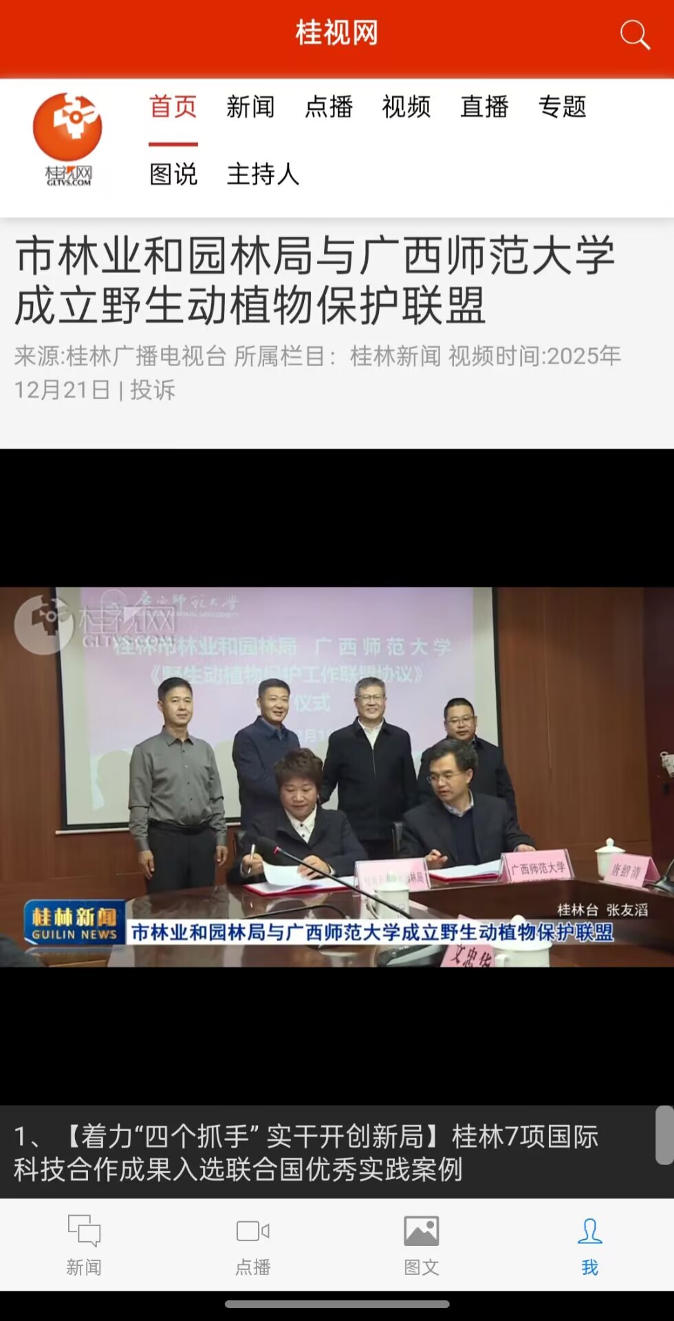 12月19日,桂林广播电视台以《市林业和园林局与广西师范大学成立野生动植物保护联盟》为题,关注报道我校与市林业和园林局正式签署野生动植物保护工作联盟协议,标志着桂林市校地协同保护生物多样性步入制度化、常效化的新阶段。