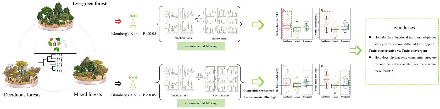 仅依靠分类学多样性未能充分阐释森林生态系统中物种共存的构建机制与驱动因素。本研究通过功能性状结合系统发育的视角,探讨了亚热带喀斯特森林的群落构建机制。研究结果发现功能性状与系统发育在揭示群落构建机制上具有明显互补性:功能性状反映出植物生态策略沿环境梯度从“获取型”向“保守型”的生境筛选作用;而系统发育则识别出不同森林类型主导构建机制的不同——落叶林以环境过滤为主,混交林和常绿林则更多受竞争排斥和随机过程支配。这一结果表明,单一研究视角难以全面捕捉群落的复杂构建机制,而探索功能性状结合系统发育发生的解耦(互补)的内在驱动机制,将是深入理解生物多样性维持机制的关键。未来研究需要整合系统发育和基于功能性状的视角,甚至可能纳入更多维度(如胁迫耐受性等),以更深入揭示群落构建机制。