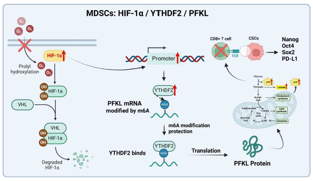 本研究发现,在肝癌缺氧微环境中,关键转录因子HIF-1α被激活,并直接启动下游基因YTHDF2的表达。YTHDF2作为一种m6A RNA修饰的“阅读器”,能够特异性识别并稳定糖酵解关键限速酶PFKL的mRNA,从而显著增强MDSCs的糖酵解代谢活性。这种代谢重编程不仅为MDSCs提供能量,更使其分泌大量乳酸等免疫抑制分子,进而压制抗肿瘤的CD8⁺ T细胞功能,并促进具有自我更新能力的肝癌干细胞(CSCs)的存活与免疫逃逸。