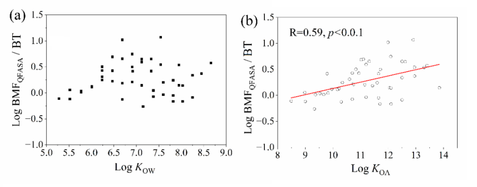 图2. S/MCCP同系物的LogBMF与黑眶蟾蜍(BT)食物链中的Log KOW和Log KOA的关系