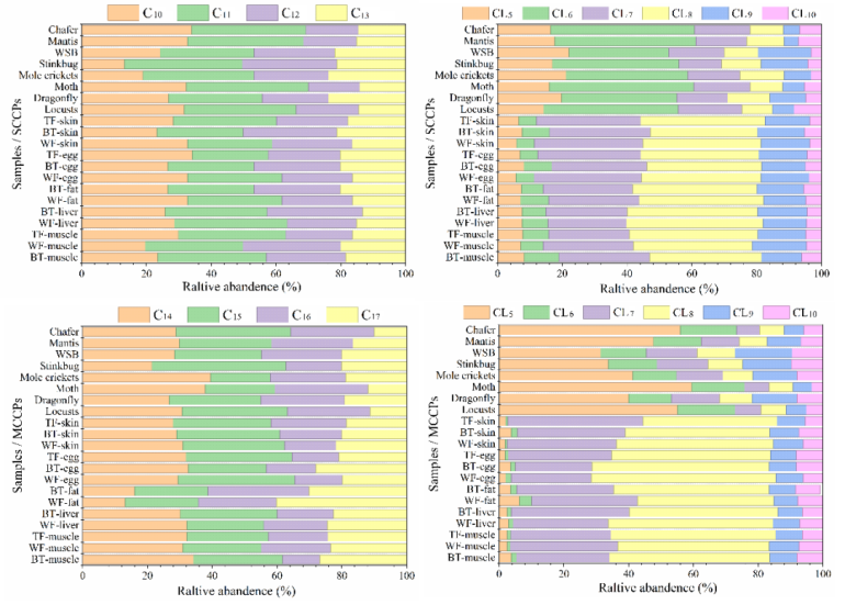 图1. 电子垃圾回收场的两栖动物组织(包括肌肉、肝脏、卵和皮肤)和8种昆虫中S/MCCPs的同系物含量。