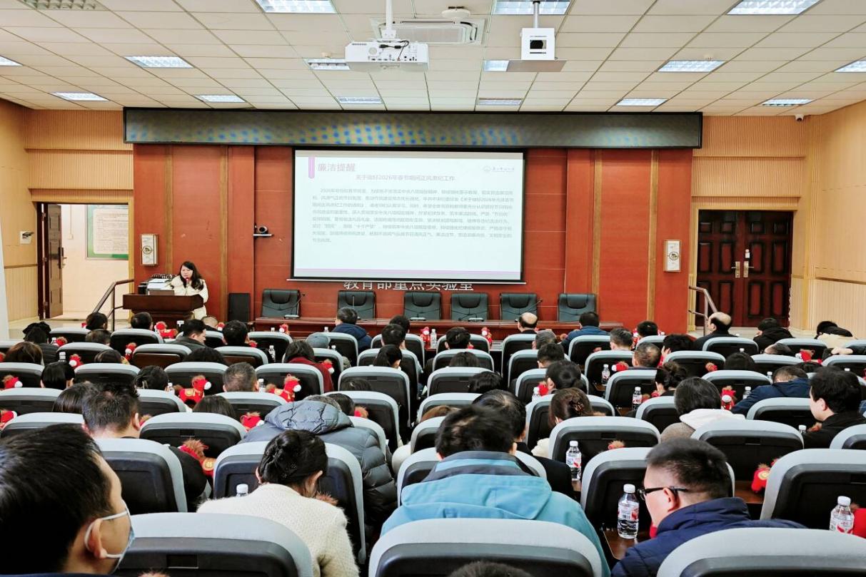 会议传达中共中央纪委《关于做好2026年元旦春节期间正风肃纪工作的通知》要求,组织全院教职工集中观看警示教育微视频《绘好科研经费使用廉洁底色》,就寒假及春节期间廉洁自律和师德师风建设有关事项作要求,要求全体教职工严守纪律规矩,强化底线思维,将廉政要求和师德规范内化于心、外化于行,共同维护风清气正的育人环境。