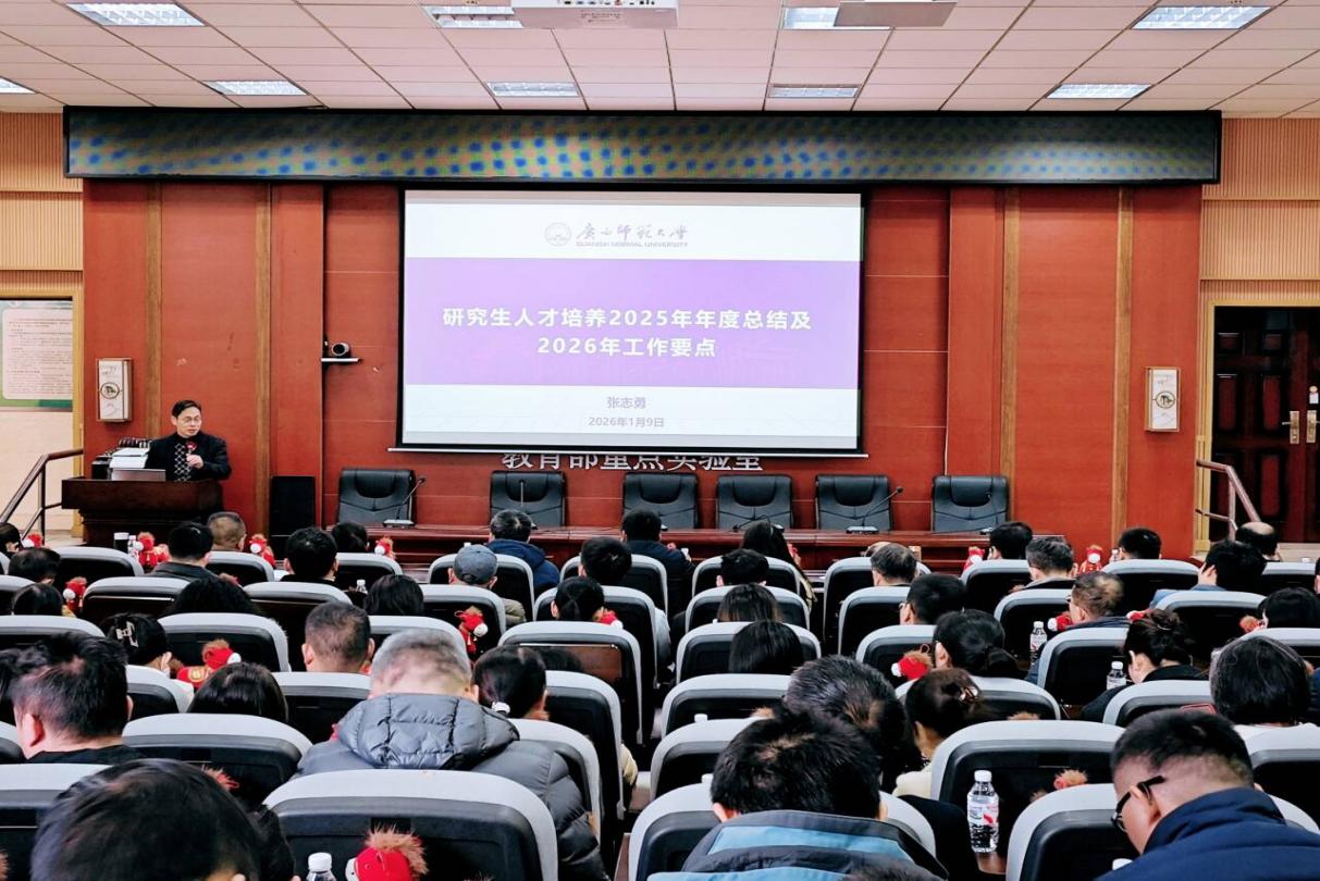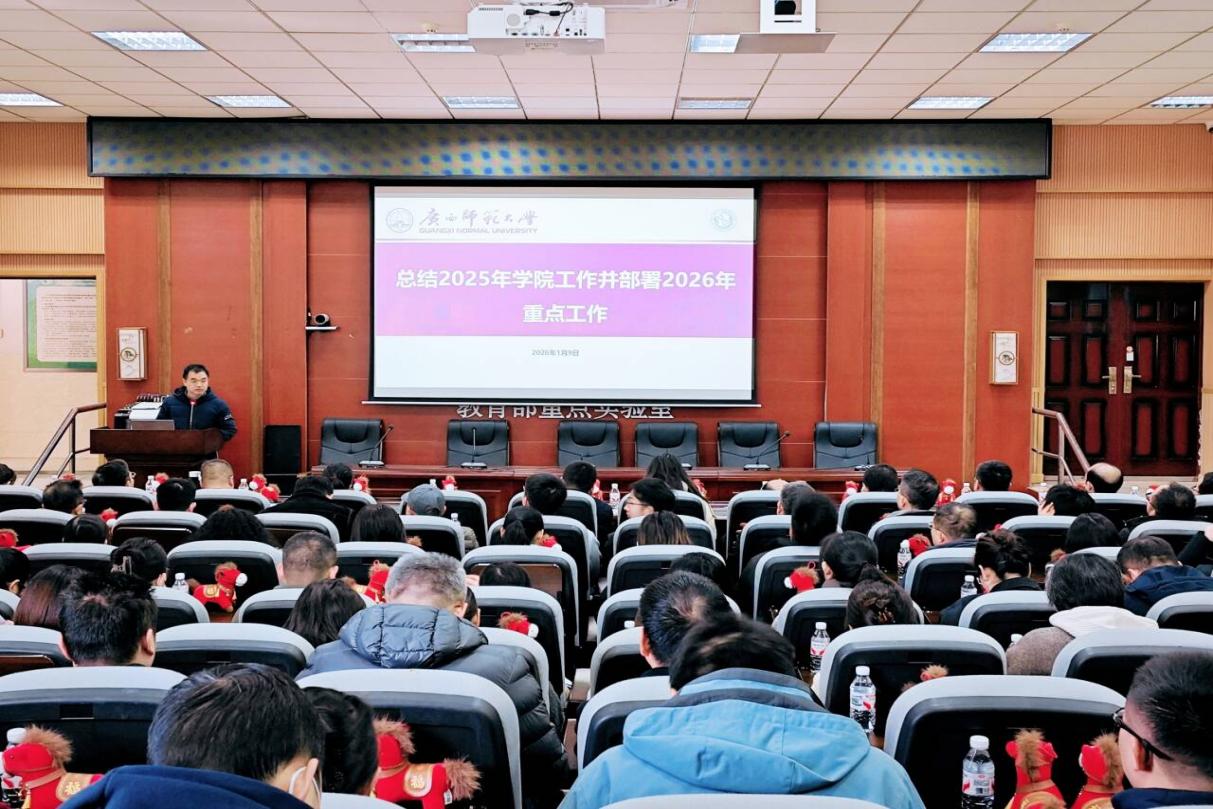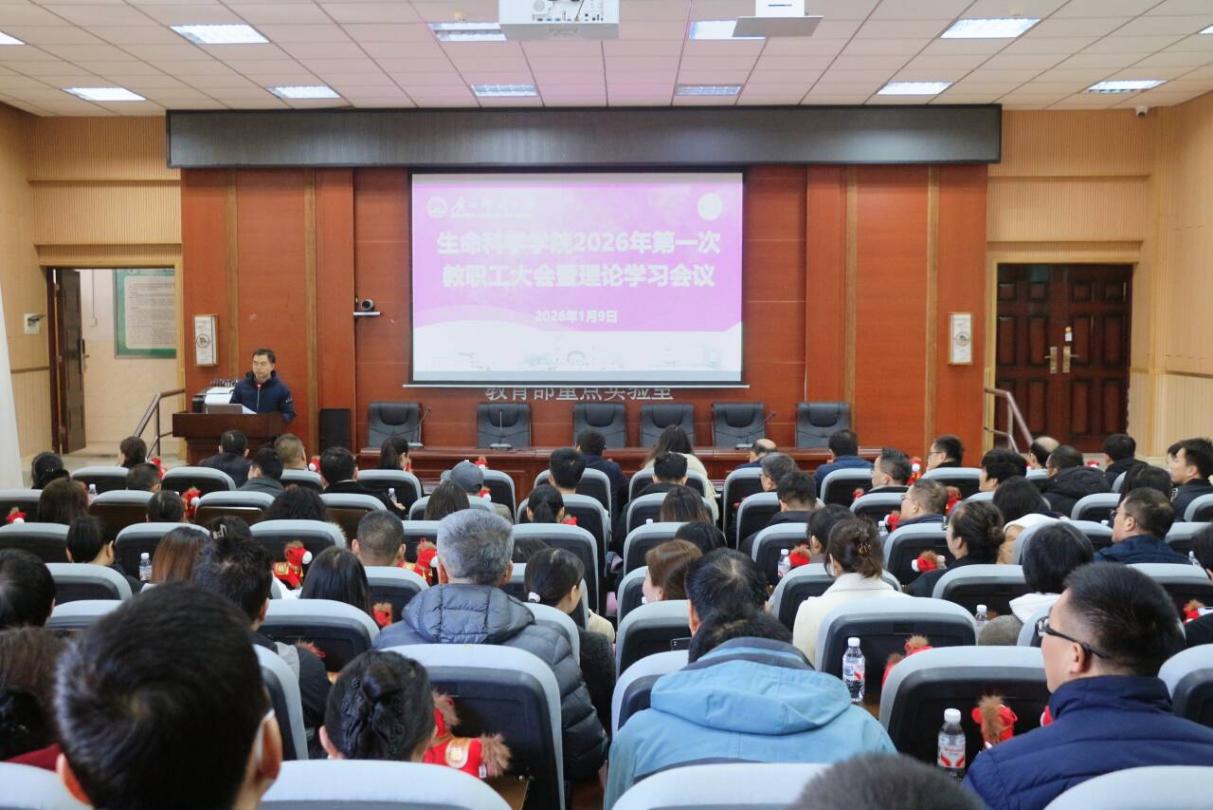 1月9日上午,生命科学学院在雁山校区伯康楼112报告厅召开2026年第一次全院教职工大会暨理论学习会议。学院党政领导班子及全体教职工参加会议。会议由学院行政主要负责同志主持。