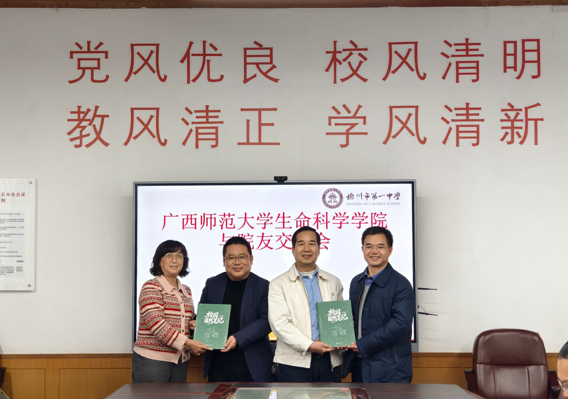 在梧州市委组织部、岑溪市汇港仓储有限责任公司、梧州市教科所、岑溪市教科所生物教研员,梧州高中、梧州市第一中学、梧州市第三中学、梧州市第四中学、梧州市第十六中学、岑溪中学、岑溪市第二中学、岑溪市第三中学等工作的院友参加座谈交流。座谈会期间,学院向参加座谈的院友赠送了《广西师范大学校园自然笔记》。