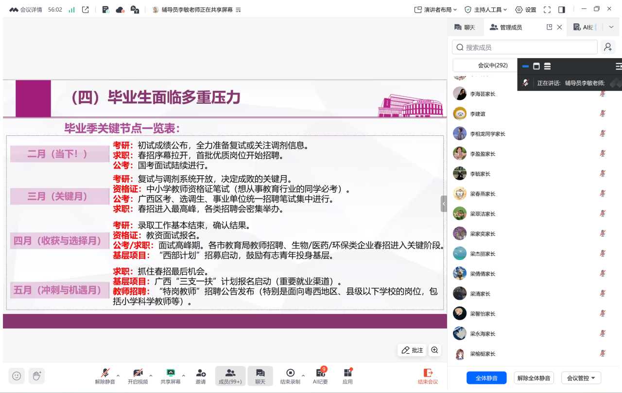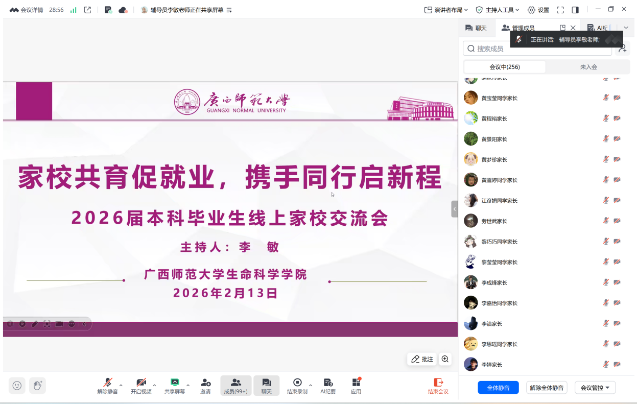 为扎实推进寒假促就业暖心行动,进一步畅通家校沟通渠道,凝聚育人合力,2月13日晚,生命科学学院召开“家校共育促就业,携手同行启新程”2026届本科毕业生线上家校交流会。学院分管学生工作负责人、毕业班专兼职辅导员及全体2026届本科毕业生、家长参加会议。