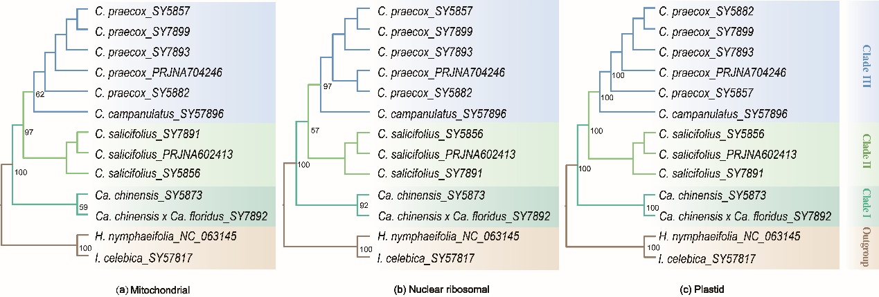 图2 蜡梅科植物基于线粒体、叶绿体、及核糖体顺反子数据集的系统发育关系