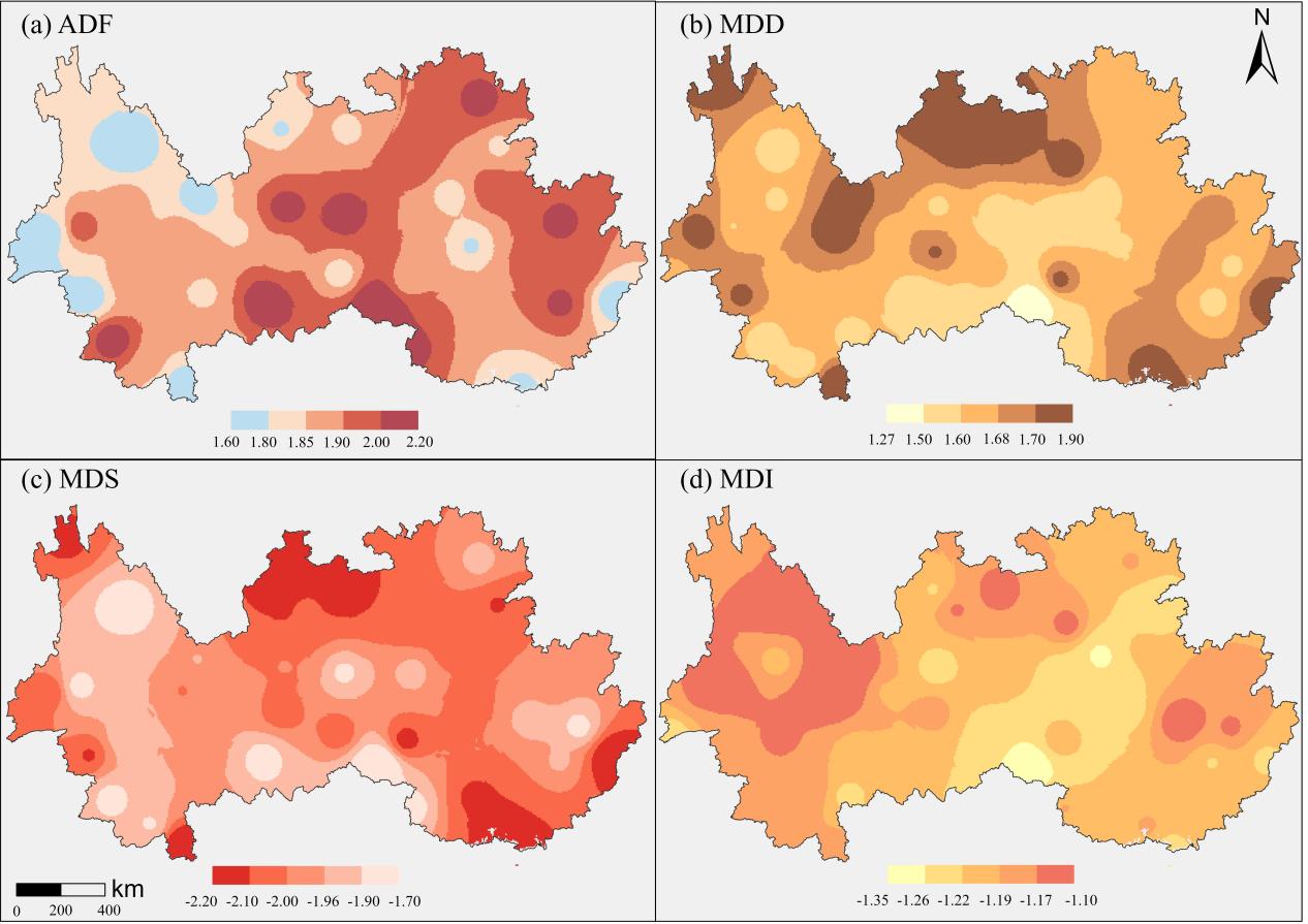 图2 西南喀斯特岩漠化区干旱特征(RDI)空间分布(1992–2022):(a) 年干旱频率(ADF);(b) 平均干旱持续时间(MDD);(c) 平均干旱严重度(MDS);(d) 平均干旱强度(MDI)