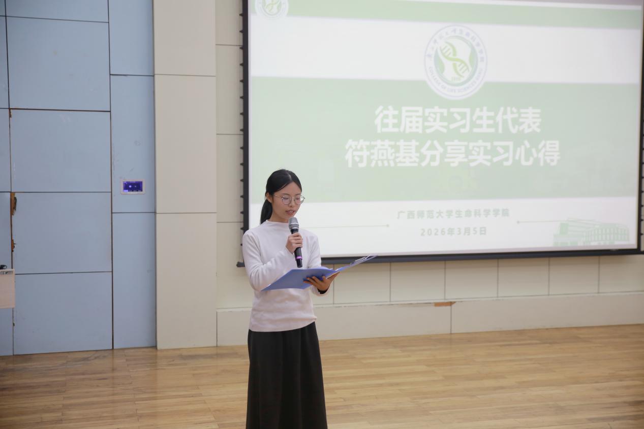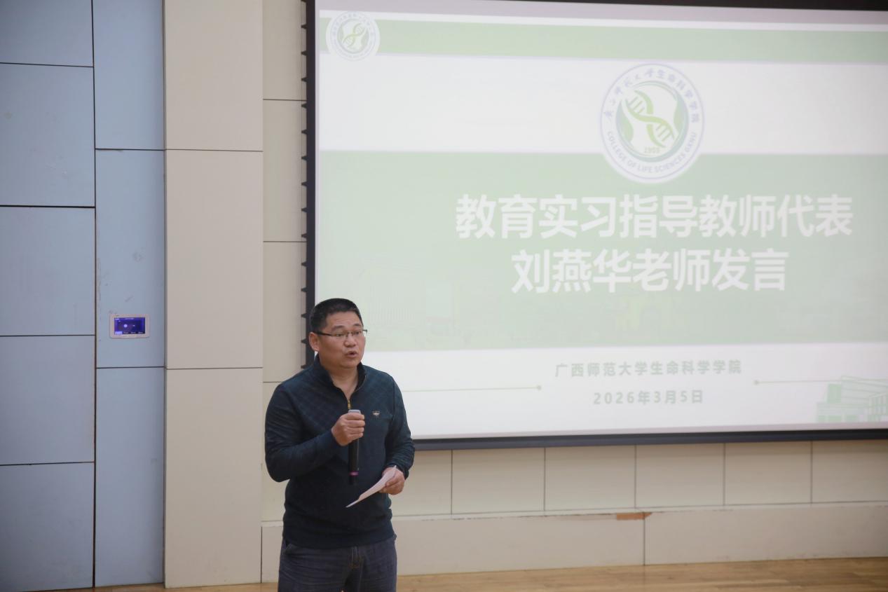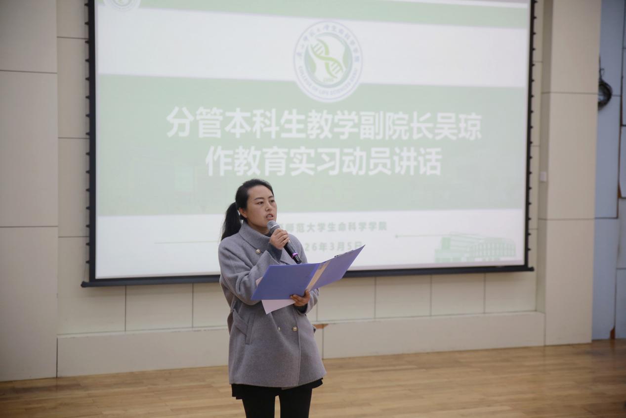 实习动员环节,分管本科生教学副院长详细介绍了本科教育实习的基本情况、任务安排、注意事项以及纪律要求,强调实习是师范生培养的关键环节。她要求同学们严守纪律、确保安全,在实习中努力做到“三个学会”,实现理论素养与实践能力的双提升。教育实习指导教师代表围绕“想做、会做、善做”三个方面,给同学们提出实习意见与期许。往届优秀实习生代表围绕备课、听课、带班等维度分享实习经验,为同学们提供经验参考。