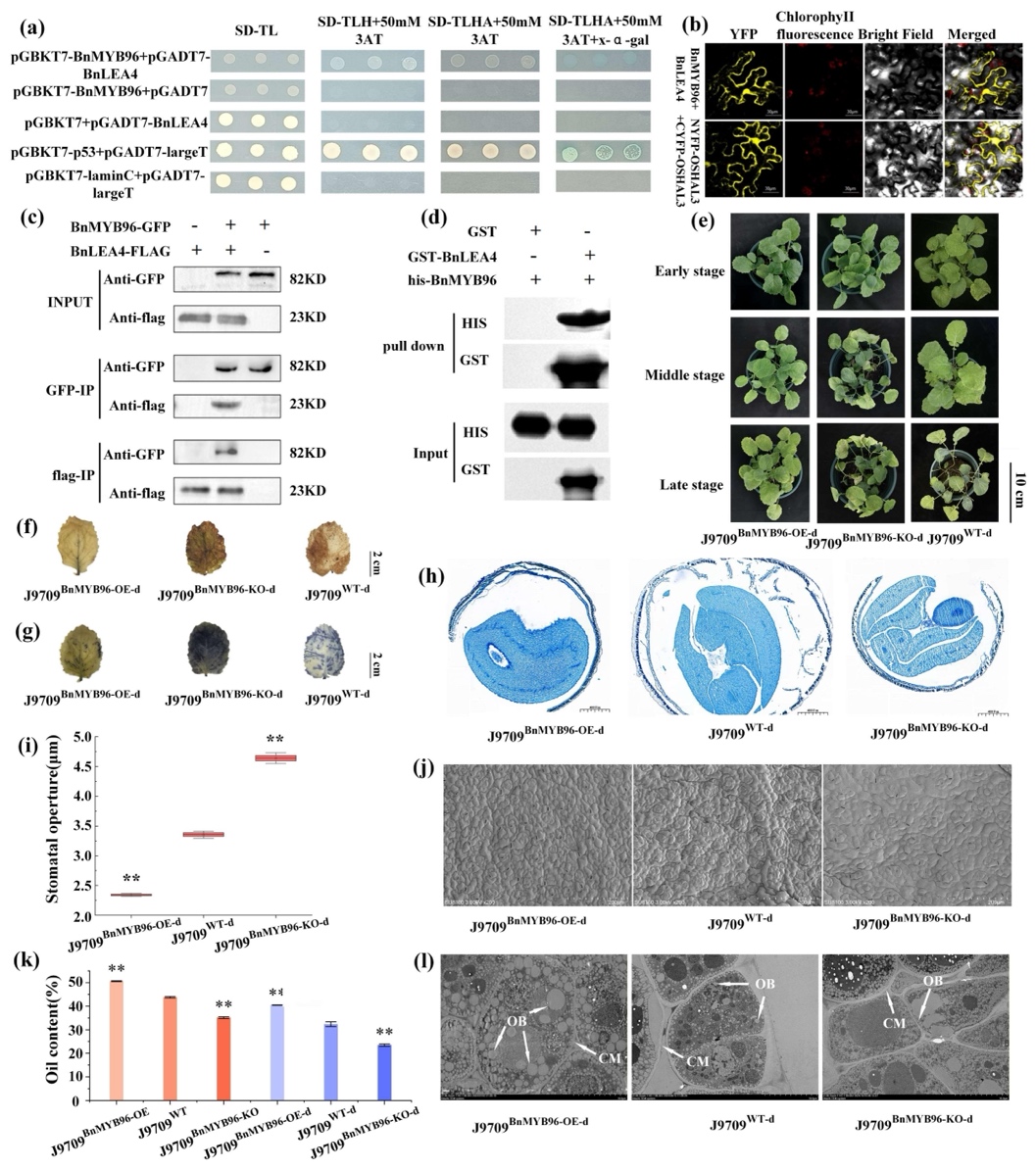 近日,植物学领域经典期刊《Plant Journal》(中科院1区TOP,2025分区表,五年影响因子7.1)在线发表了题为“BnLEA4 and BnMYB96 targeting BnLTP2 to enhance drought tolerance and oil accumulation in Brassica napus L.”的研究论文。该研究阐明了BnMYB96可与BnLEA4蛋白互作,并且作为转录因子结合BnLTP2的启动子,激活BnLTP2的表达,从而提升甘蓝型油菜干旱耐受性与种子含油量的分子机制,该研究为培育兼具耐旱性和高含油量的油菜新品种提供了关键理论依据和技术支撑。