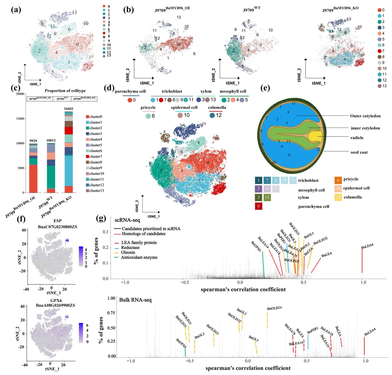 本研究还在单细胞水平解析了甘蓝型油菜发育种子的细胞异质性,利用单细胞测序scRNA-seq 首次在甘蓝型油菜中鉴定出与脂质积累相关的实质细胞群(cluster 0),发现 BnMYB96 可调控油脂相关基因(OLE1、OLE2、OBAP1A等)的细胞特异性表达,为精准调控提供了细胞层面的靶点。结合多个转基因株系的转录组测序显示,BnMYB96和 BnLTP2 可上调光合碳固定、脂肪酸合成相关基因表达,通过维持光合效率、减少氧化损伤、稳定脂质储存等途径,实现耐旱性与含油量共同提升。